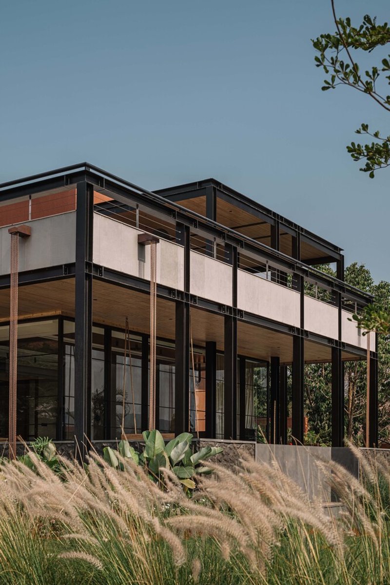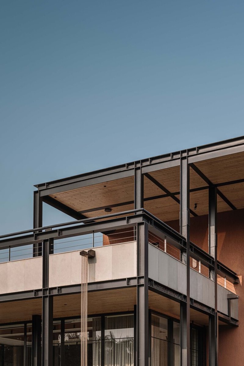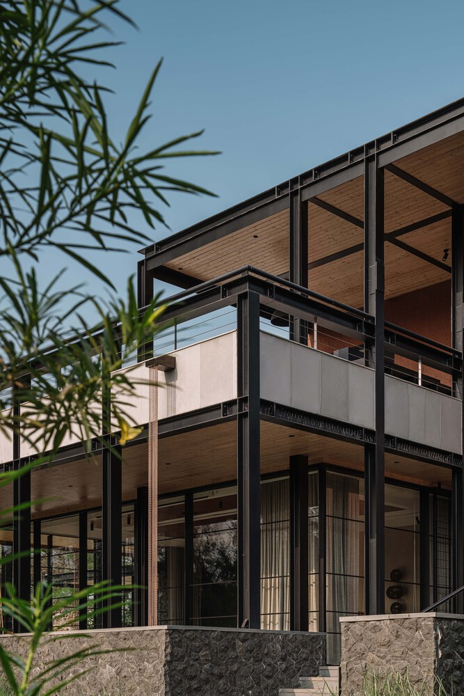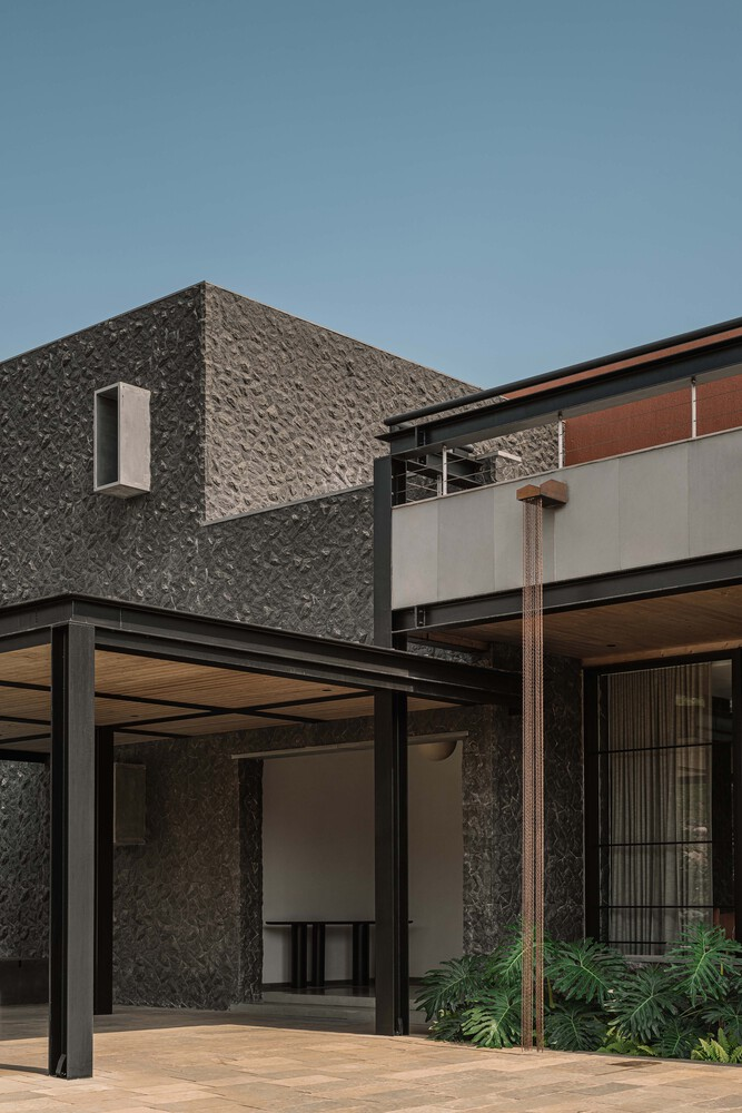 The transformation employed brutalist design principles, emphasizing structure, function, and unadorned material beauty. Concrete, steel, raw stone, and glass come together in deliberate contrast, offering a cohesive, textural experience. The exterior showcases a visible steel frame paired with stone-clad walls and expansive glass windows. Full-height sliding doors and terraces allow the house to remain open and airy, balancing its bold structural language with human-scale comfort and openness to the outdoors.