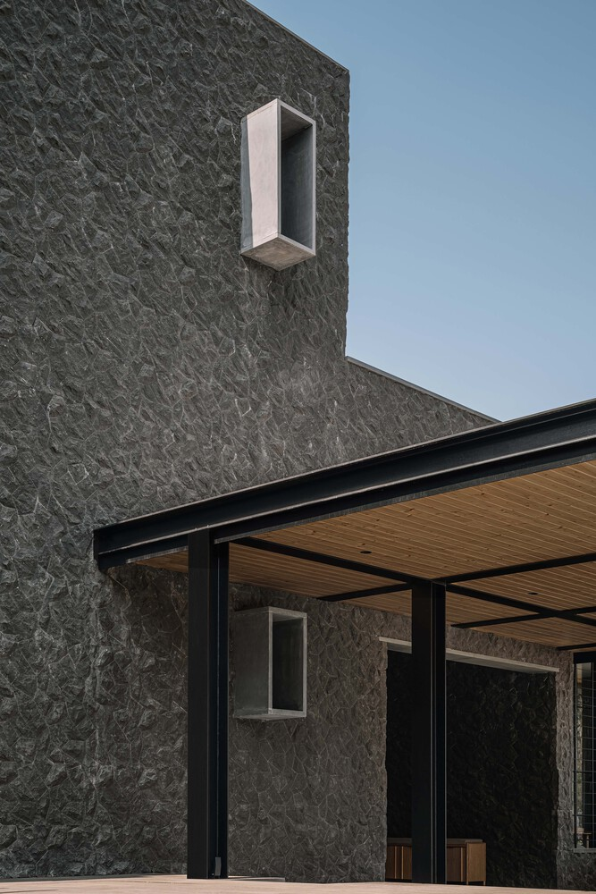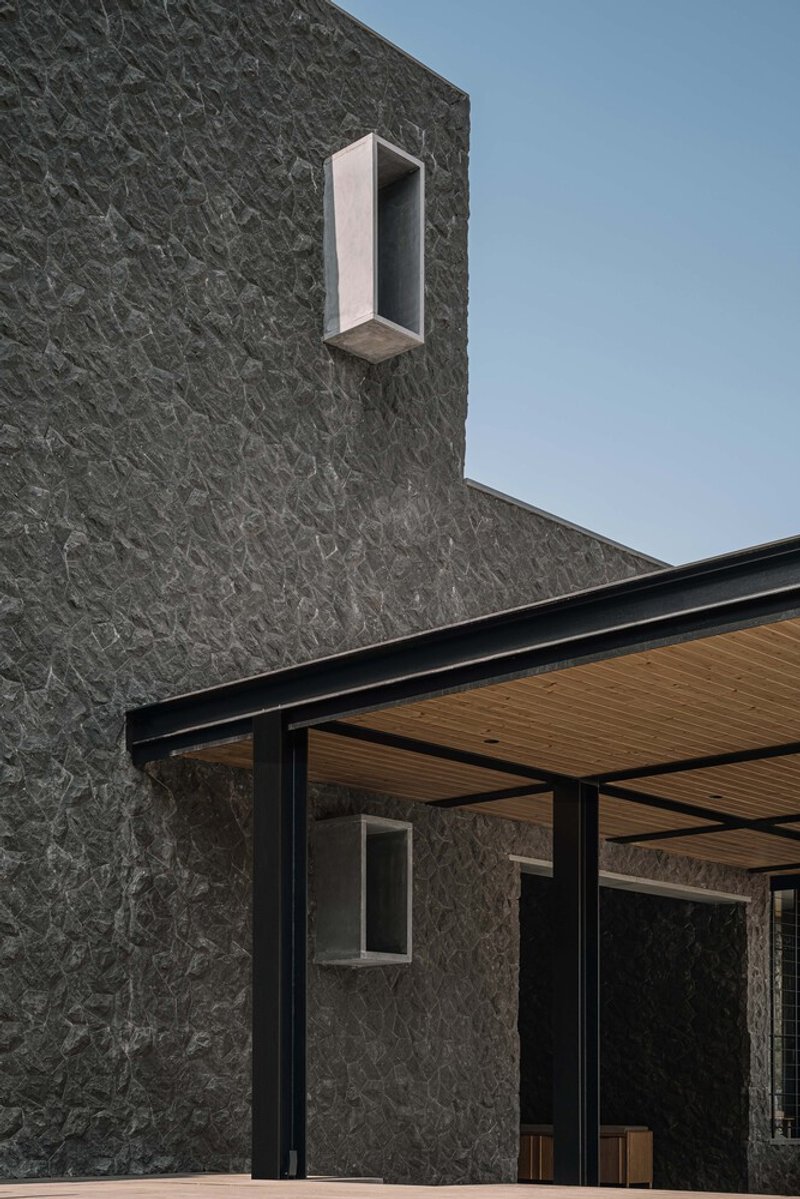 Windows protrude from the facade in a rhythmic gesture, reinforcing the boldness of the house’s geometric form while adding moments of surprise and interaction. The composition plays with light, mass, and void, encouraging the inhabitants to engage with the spaces beyond their utilitarian use. Each architectural gesture holds dual meaning—practical and poetic—underscoring the house’s dual identity as both a personal memoryscape and a statement of material expression.