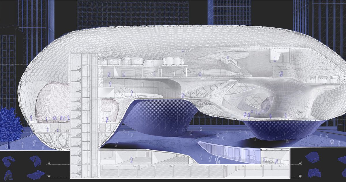 A bubble has no walls. It has a surface that encloses a volume, and inside it everything is connected to everything else. Bubble Hub, a co-living project by Tatiana Taratuta and Danil Nazarov, takes this literally. It proposes a single translucent dome containing an entire co-living village: private pods, communal libraries, lounges, workspaces, and public plazas, all under one continuous shell with no corridors and no doors between shared spaces.
