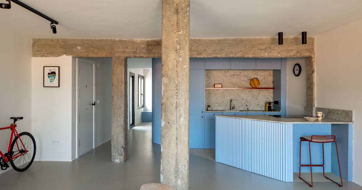 One of the most striking features of the Burgatoi Renovation is the wooden curve clad in triangular, lacquered blue panels. This textural surface reflects changing daylight, emphasizing its sculptural form while adding warmth and intimacy to the apartment. The wood introduces a tactile quality and human scale, contrasting against the clean, continuous epoxy resin flooring in soft gray, which enhances spatial fluidity and continuity.