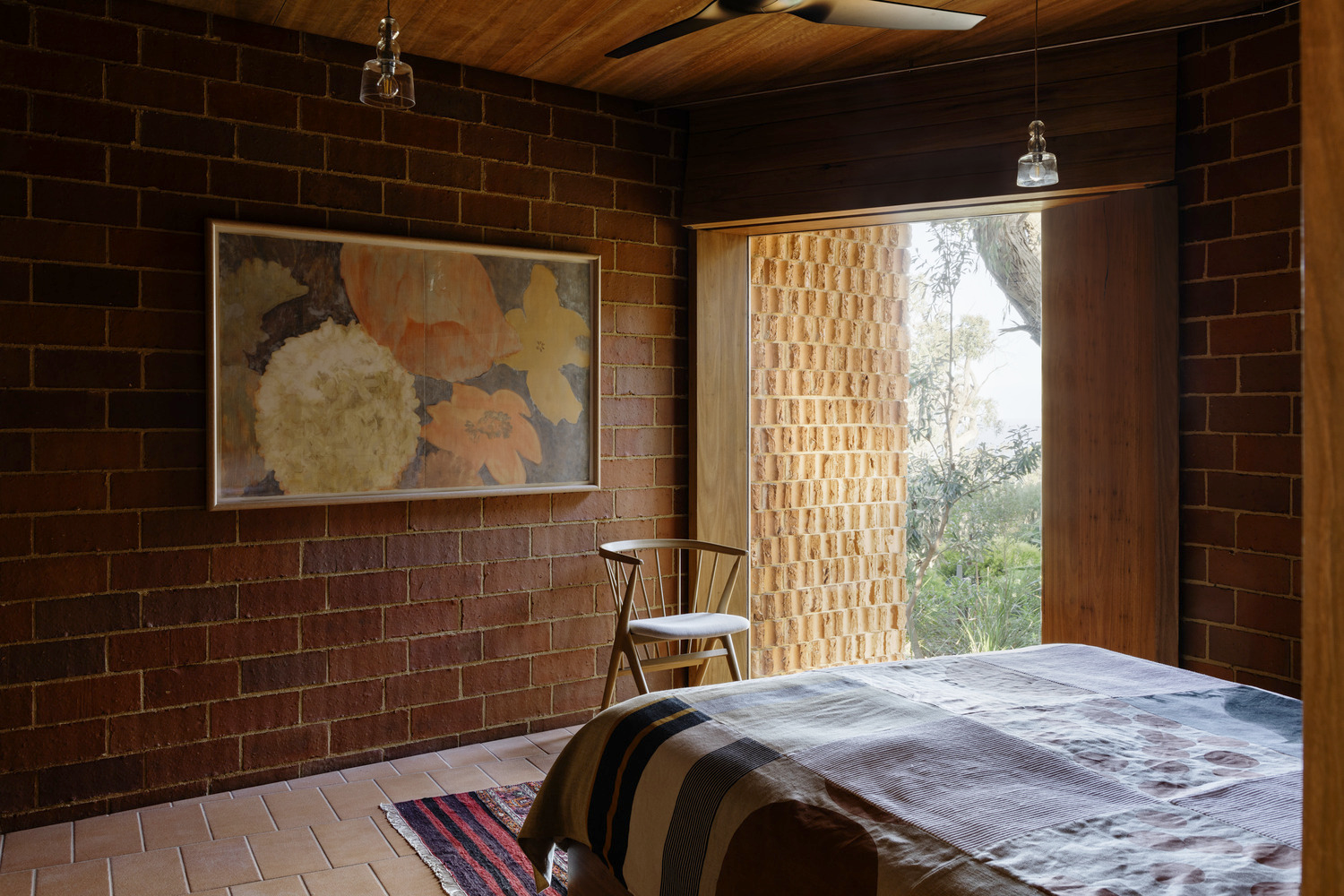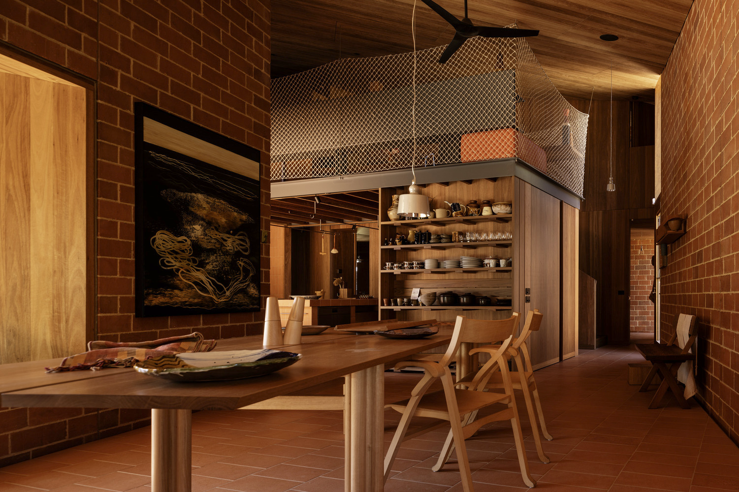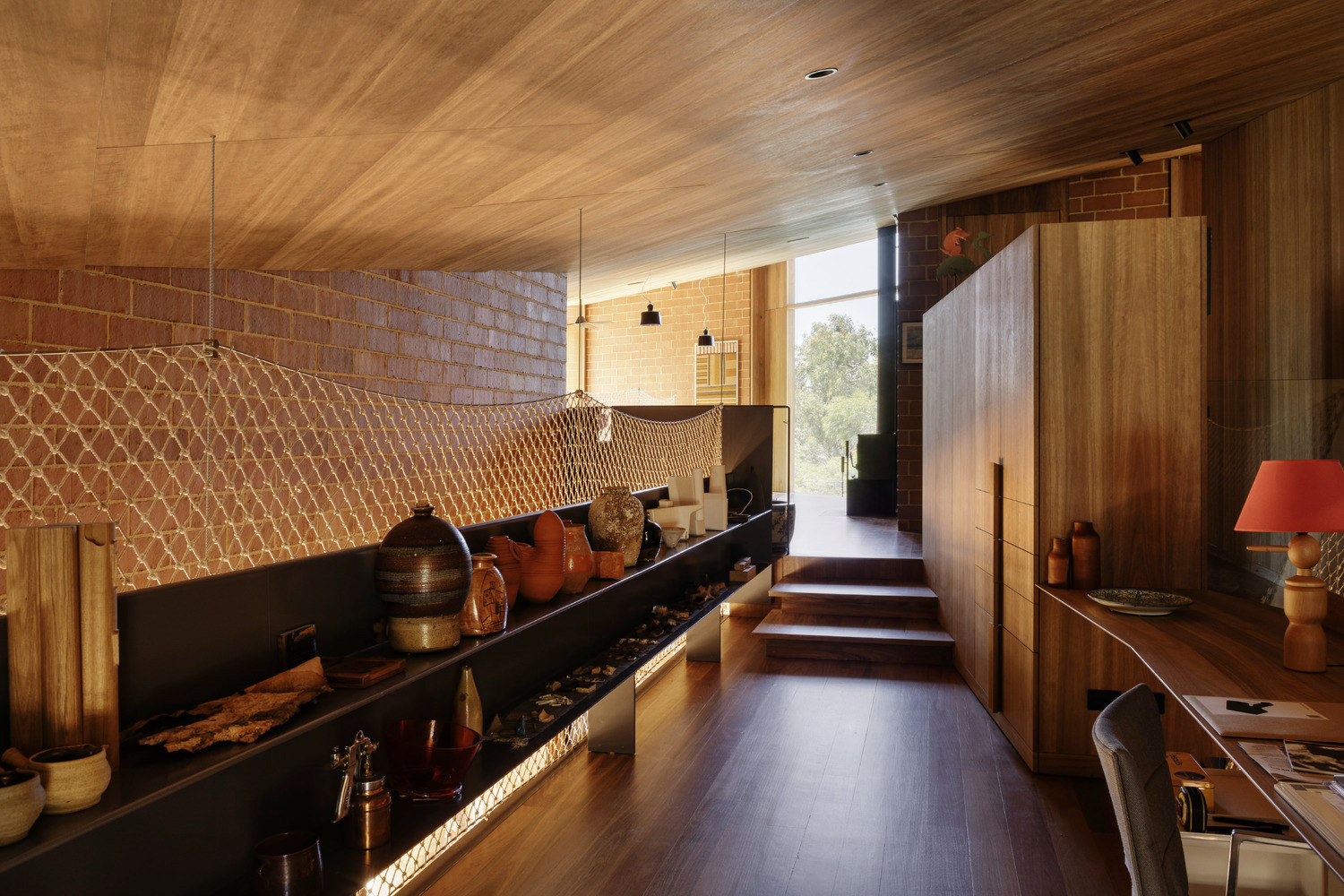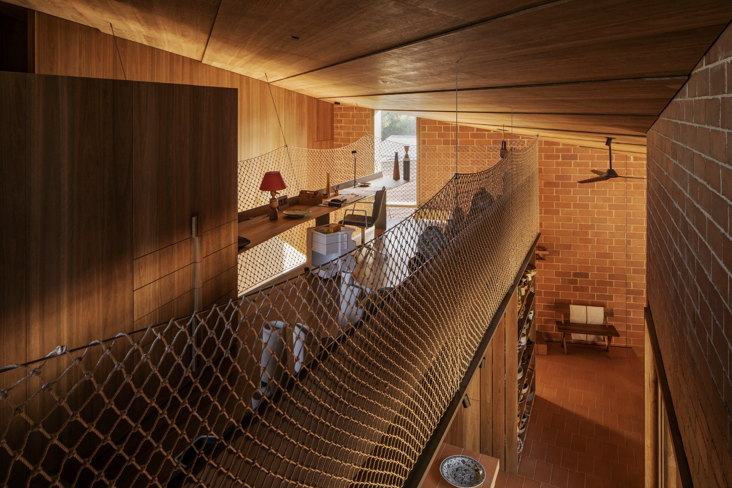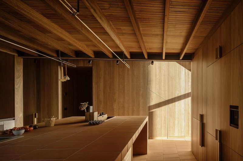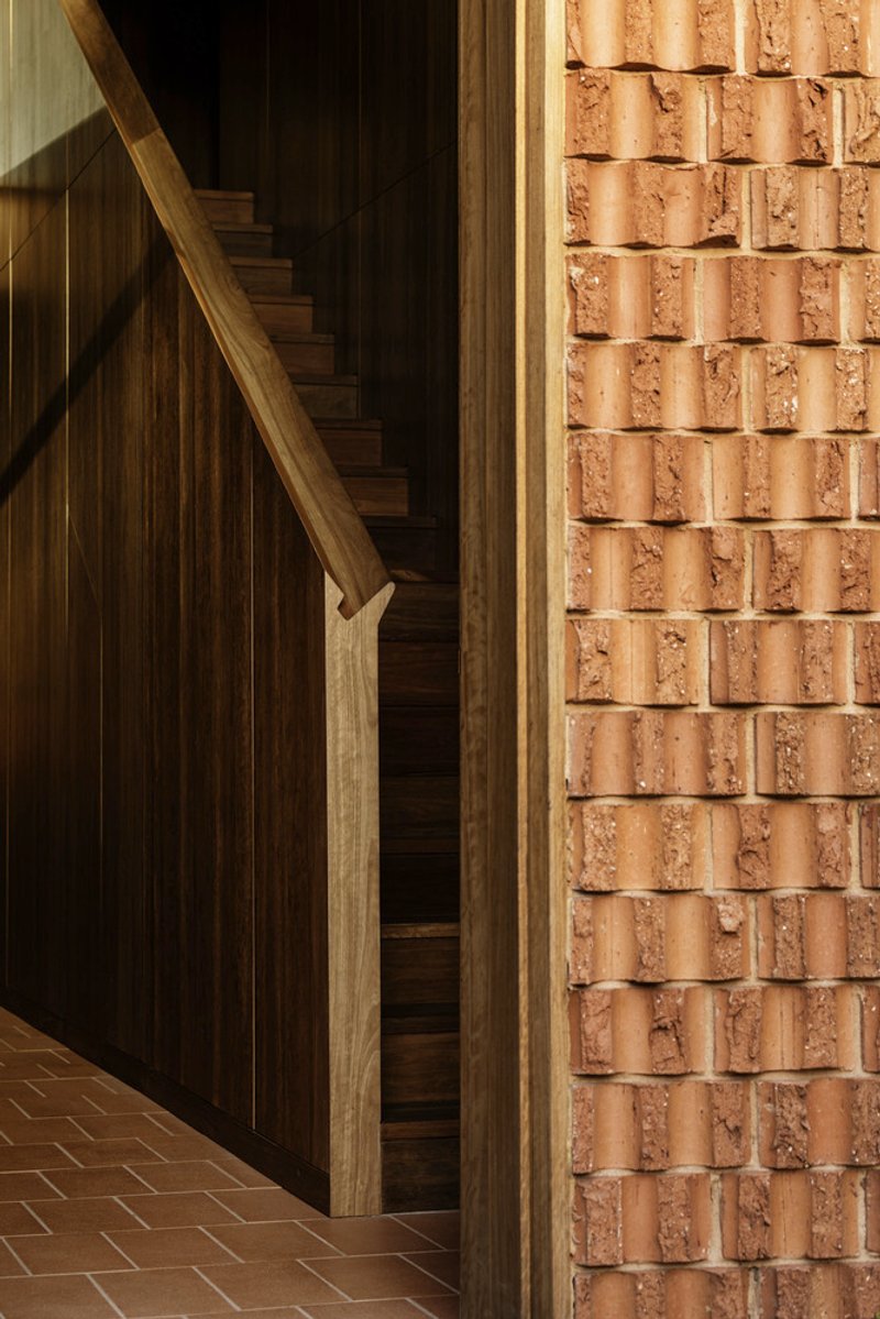 Terracotta plays a central role in the house’s material palette, appearing in exterior brickwork, interior walls, flooring, and joinery elements. The handcrafted terracotta tiles, sourced from Cotto Manetti in Chianti, Italy, not only contribute to the house’s textural richness but also enhance thermal performance. The material’s ability to conduct temperature efficiently helps regulate indoor conditions, reducing reliance on artificial heating and cooling systems.