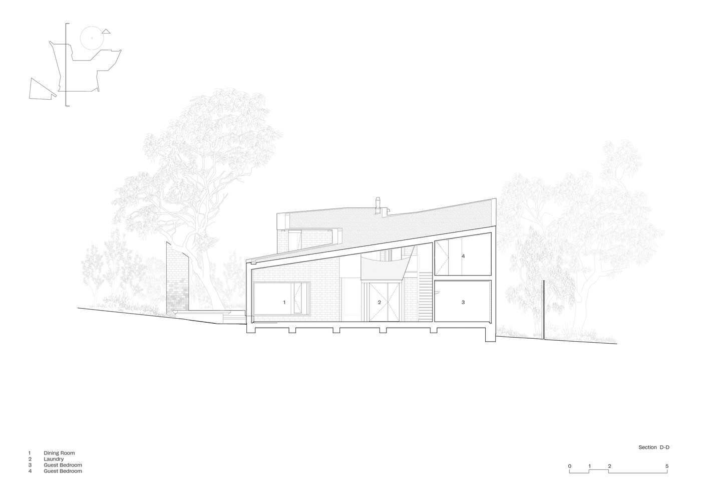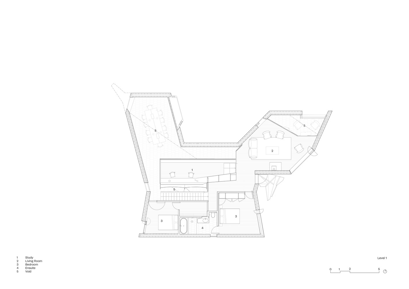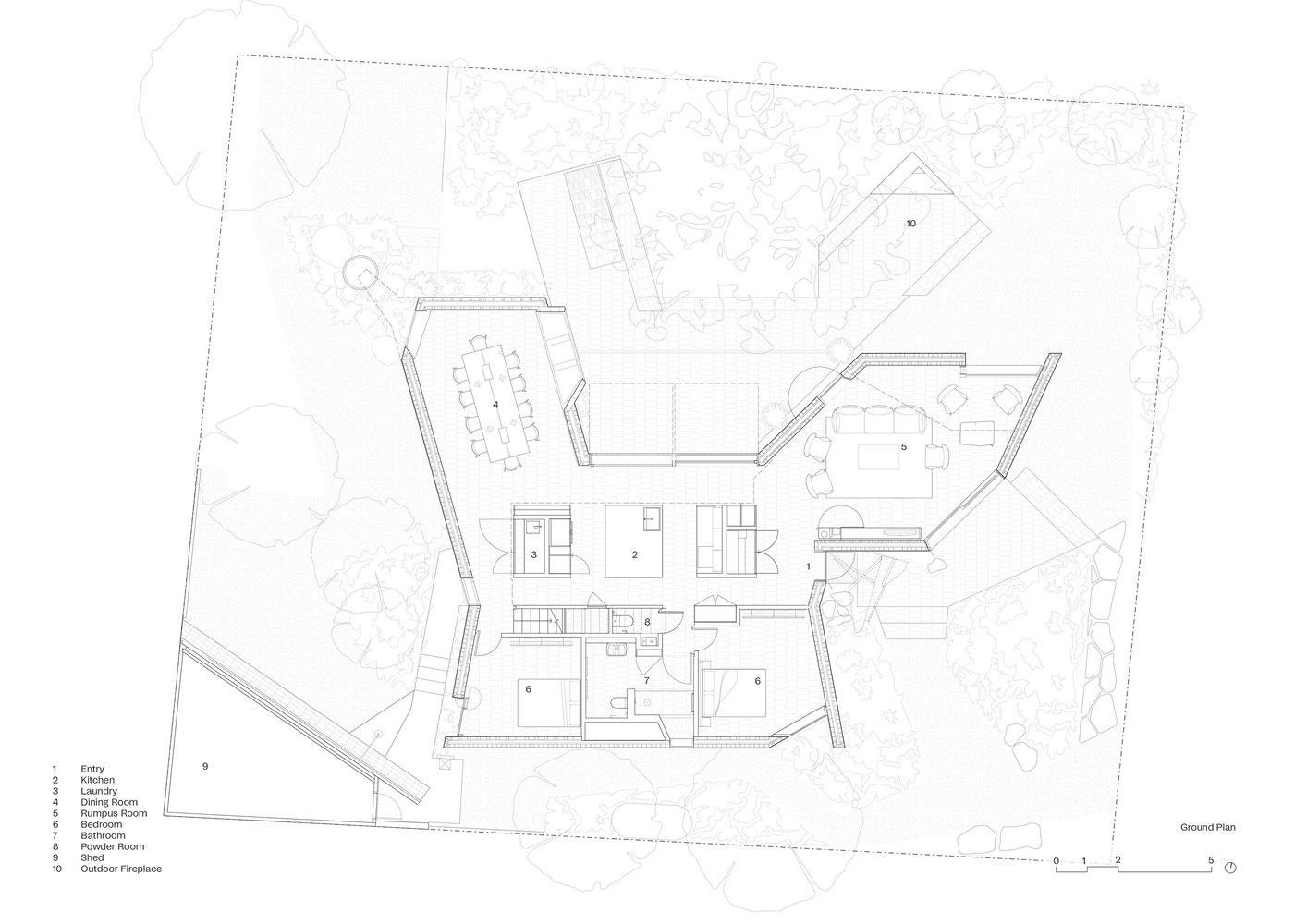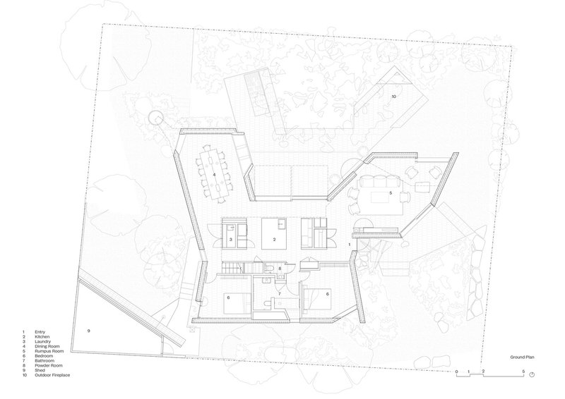 The house is structured to cater to both social gatherings and private retreats. The lower level encourages communal activities, while the upper level offers quieter spaces for solitude, maintaining a flexible and adaptable living environment.