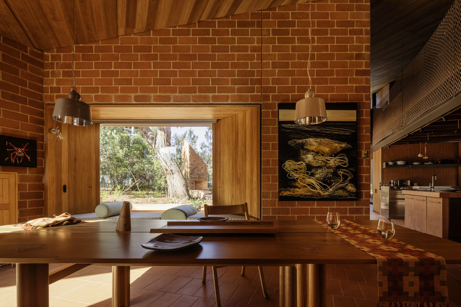 Set against the backdrop of the Southern Ocean, the house takes inspiration from the rugged cliff edges of Anglesea. The surrounding landscape, defined by coastal banksias and native vegetation, informed the design choices, particularly the use of terracotta bricks. Developed in collaboration with Klynton Krause, these custom bricks feature a raw, hand-torn texture, emulating the earthy tones and textures of the coastline. The careful selection of unglazed and glazed bricks, blending green and brown hues, ensures that the house seamlessly integrates with its natural surroundings.