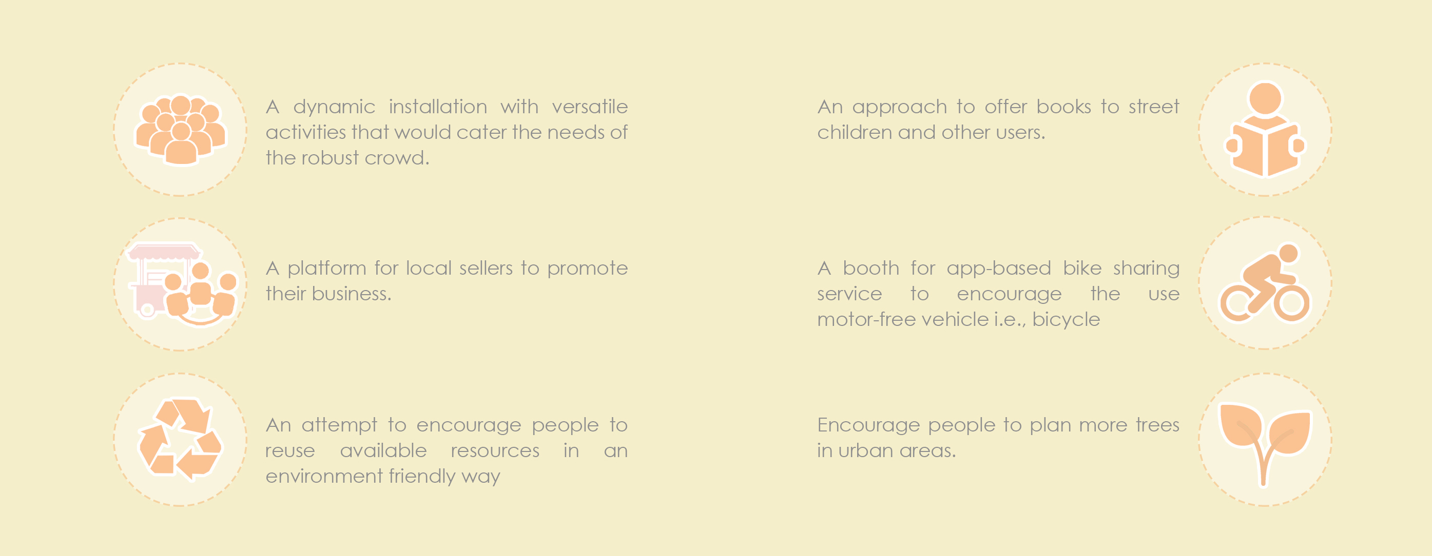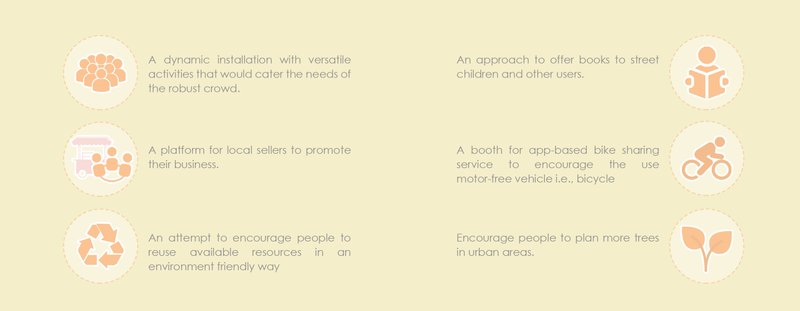 Given the context, this bustling node calls for a dynamic installation with versatile activities that would cater the needs of the robust crowd. Hence, we have come up with a design solution ‘Bustle’, that may be the perfect response to the context.