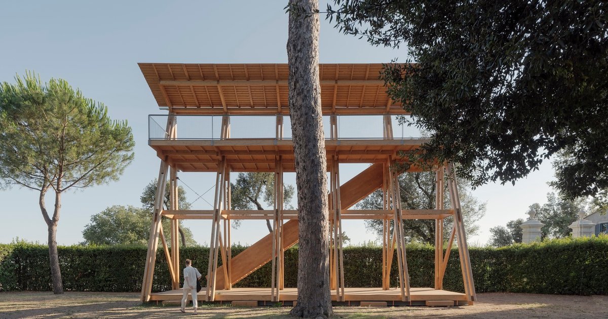 The installation features a cross-laminated timber staircase diagonally bracing the structure, mirroring the steps of the historic helical staircase inside Villa Medici’s palace. At the summit, a V-shaped timber canopy shields the observatory from sun and rain while encouraging natural ventilation across the hill.