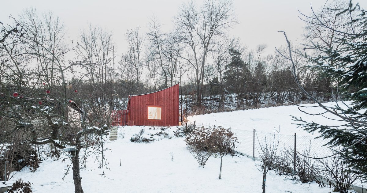 The cabin is designed for one resident with an open-plan layout. Its core concept revolves around a curved motif that traces the horizon, echoing the form of Svatobor Hill nearby. This curve transforms into an architectural statement, creating continuity between the built form and the surrounding landscape.