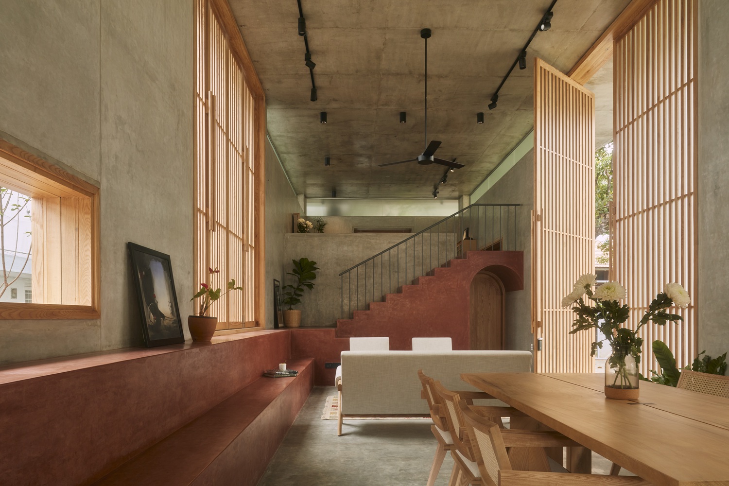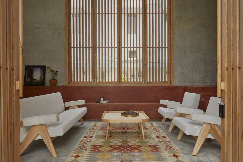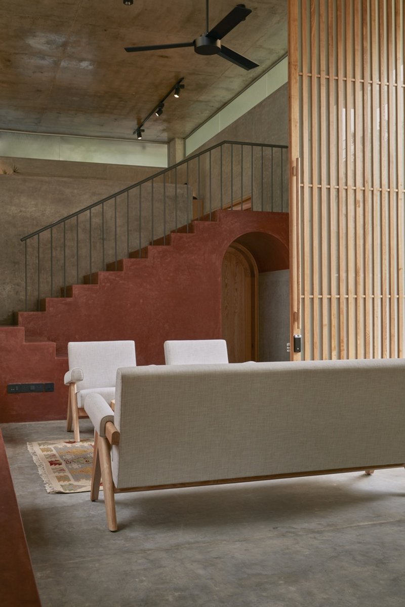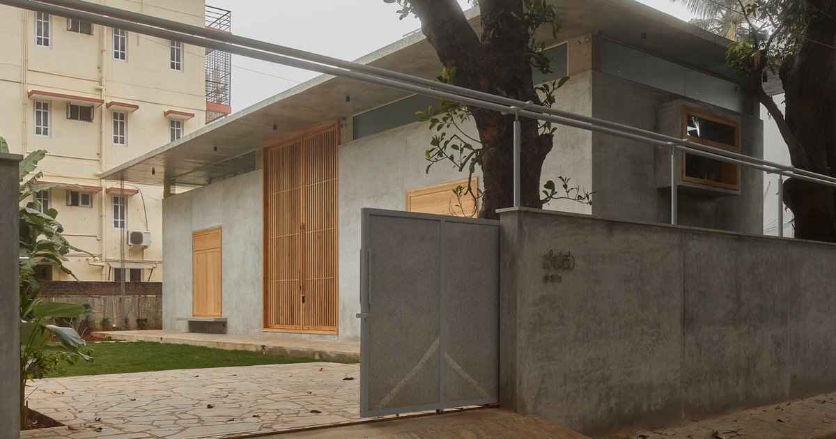 Drawing from the vernacular homes of old Bangalore, the design incorporates features that foster casual interaction. The main staircase, for example, doubles as an informal seating space reminiscent of a katte – a raised platform common in traditional neighborhoods where people gather for conversation.