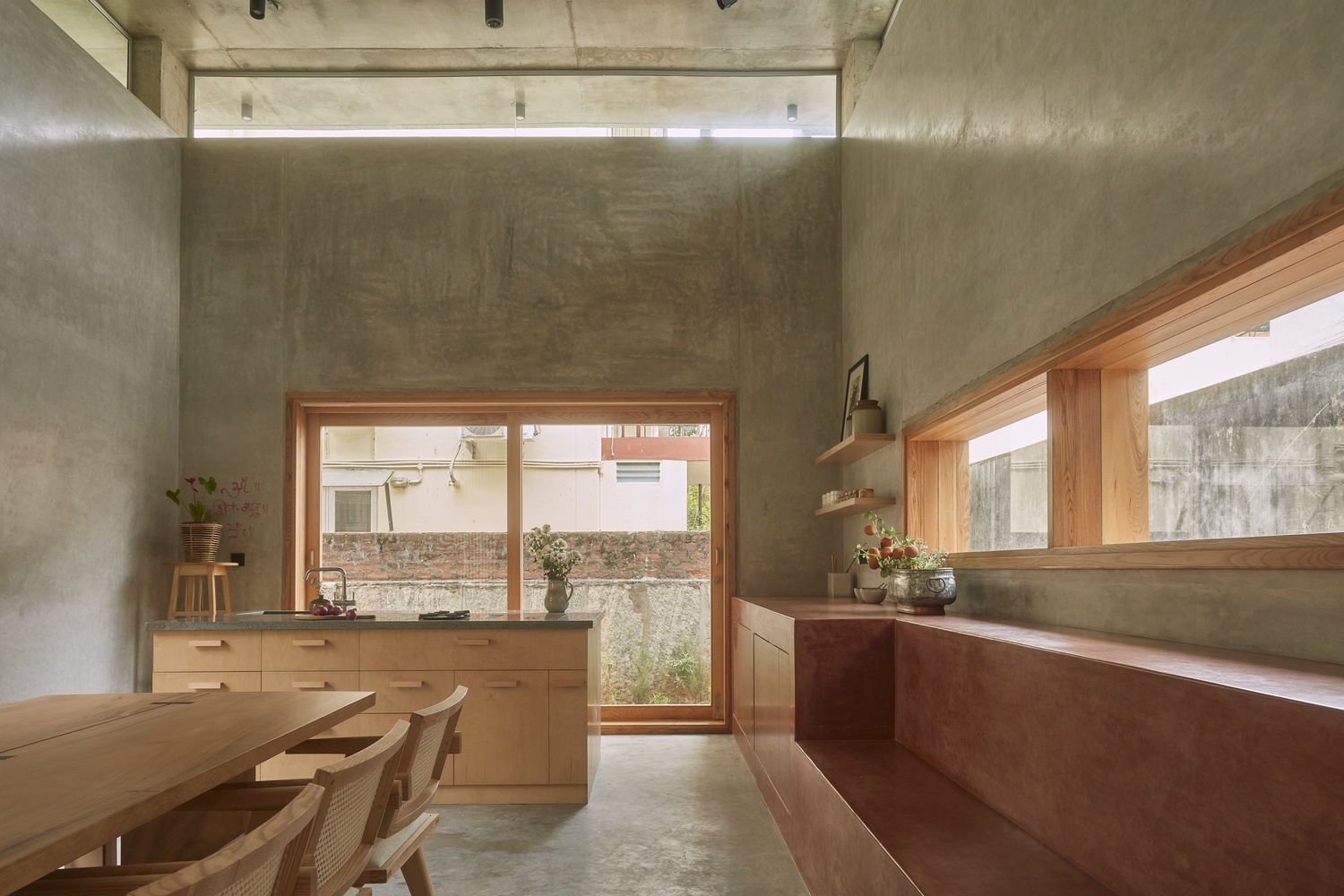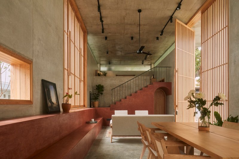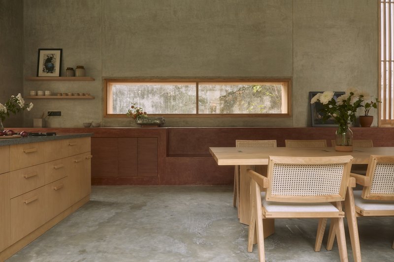 Large concrete roof slabs are softened with wooden louvers and glass panels, allowing dappled natural light to permeate the interiors. The lowered window sills invite people to sit, lean, and engage with the garden – blurring the edges between home and nature.