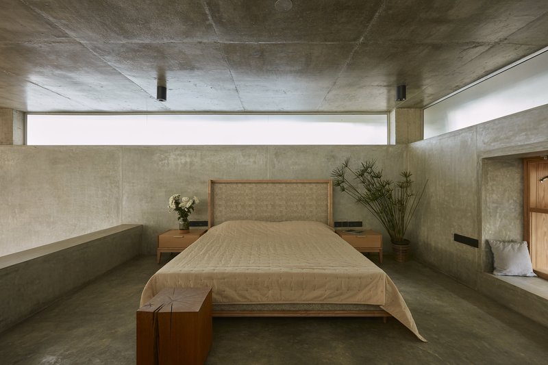 Privacy is addressed through level changes and strategically placed openings. A horizontal slit window in the washroom ensures uninterrupted views of the horizon while preserving seclusion. The interplay of 5m-high ceilings in communal areas and cozier 3m heights in the bedroom creates dynamic spatial contrasts, complemented by a bay window niche overlooking the surrounding greenery.