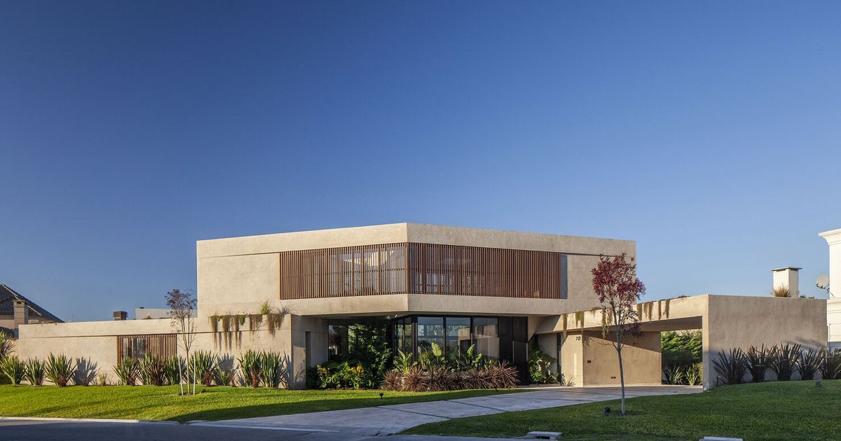 Situated in the serene town of Guillermo Enrique Hudson, Cacho House presents a bold architectural response to the constraints of a triangular site. With a generous frontage but limited rear depth, Estudio Grizzo Arquitectos was tasked with organizing a complex residential program predominantly on the ground floor while preserving outdoor space and ensuring privacy.