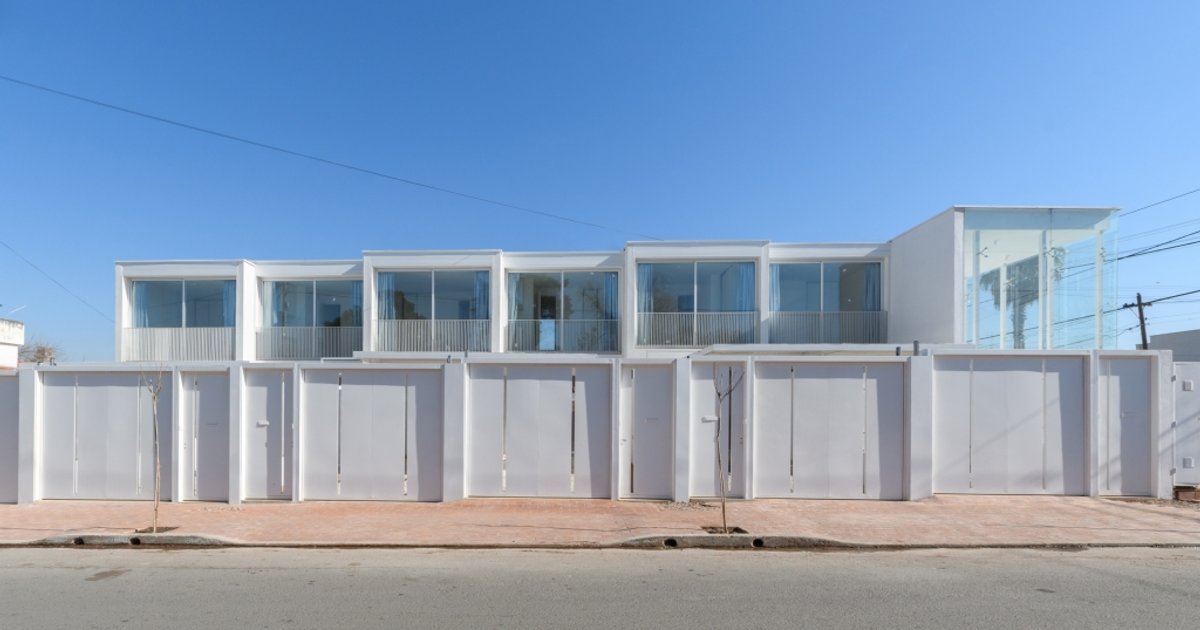 A compact mixed-use complex combining six two-bedroom homes and a transparent commercial unit, maximizing space, light, and urban connectivity in Villa Allende.