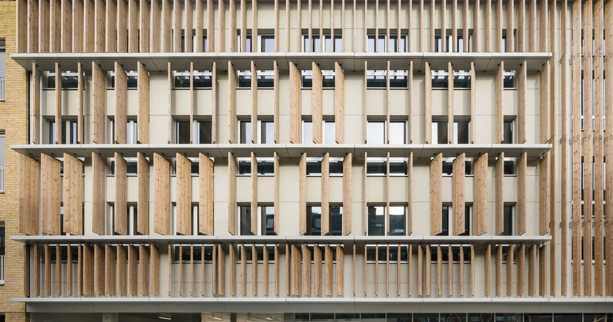 The upper three floors are constructed entirely from solid wood, offering a dismantlable, open structure that allows flexible office configurations. Vertical wooden slats, made from thermally treated FSC pine, provide passive solar shading, while horizontal lacquered fins diffuse daylight, balancing comfort and energy efficiency. Dynamic orientation of the slats ensures optimal daylight management throughout the day.