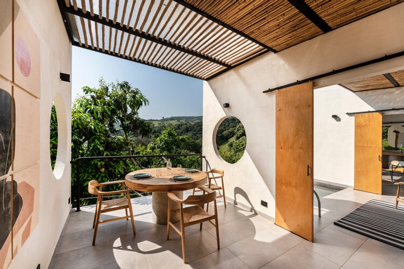 Caoba House embraces locally sourced, honest materials, highlighting regional construction traditions. The ceiling is lined with bamboo slats, bringing warmth and rhythm to the interiors. Pine wood carpentry and teak furniture, crafted using local techniques, contrast beautifully with the ruggedness of stone and ceramic elements at the base.
