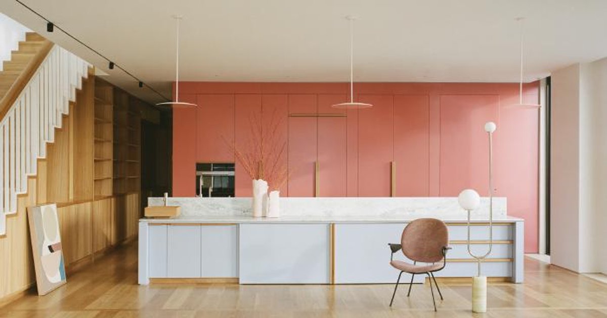 The abstract colours of the apartment contrast with the warm, natural material palette. Coloured objects are repeated in the bathroom stonework, fireplaces, and bespoke furniture pieces. Semi-circular oculus skylights celebrate the two main living spaces and reference the clients' passion for the local Art Deco architecture. This pure geometry furthers the abstract composition of the coloured volumes and is also referenced throughout the apartment with smaller semi-circular and circular oculus. The east of the apartment contains the main active social areas, including the kitchen, living, and dining. At the same time, the west is more relaxed and conducive to relaxation, with an interior/exterior lounge dubbed the 'Evening Garden'. The apartment is also loosely divided by generational lines, providing privacy between the younger and older family members.