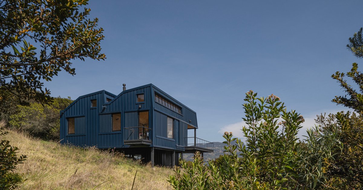 The exterior facade features stapled metal tiles, oven-painted in a navy blue hue. This color blends seamlessly with the surrounding high Andean forest, ensuring a minimal visual impact while avoiding a military-style camouflage.