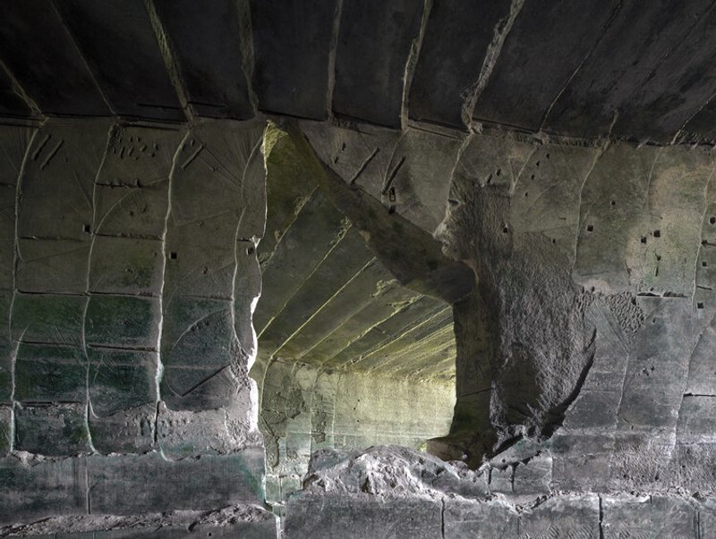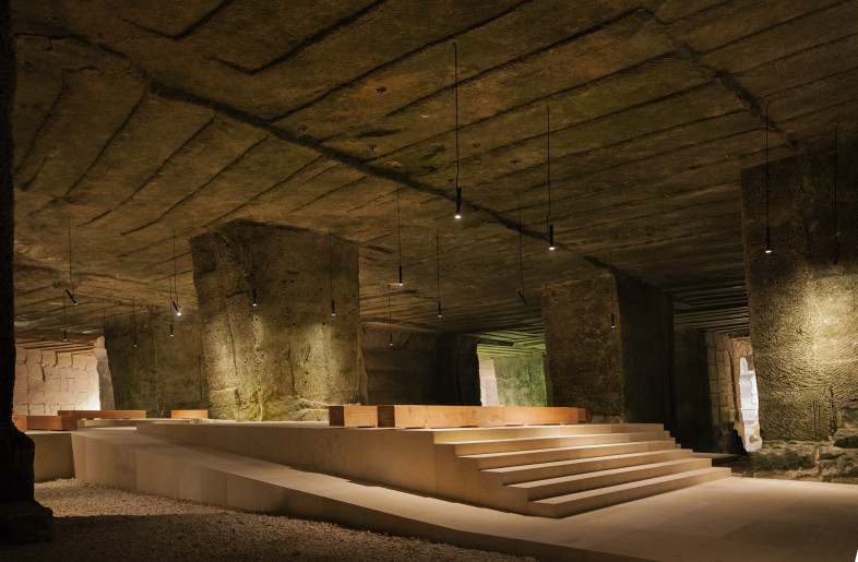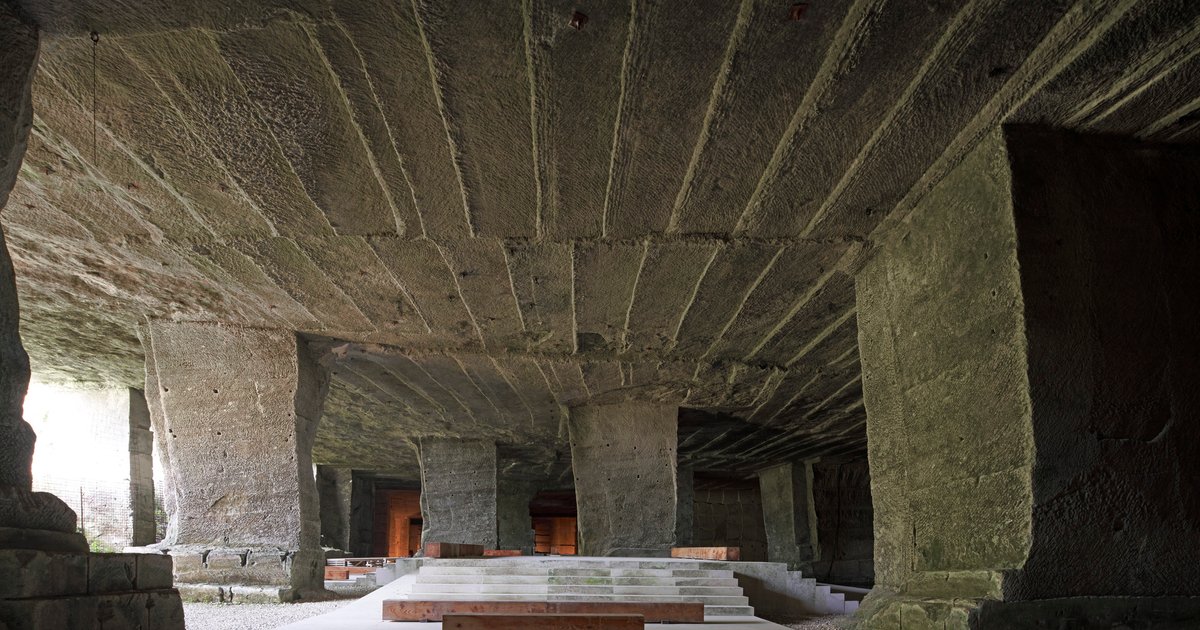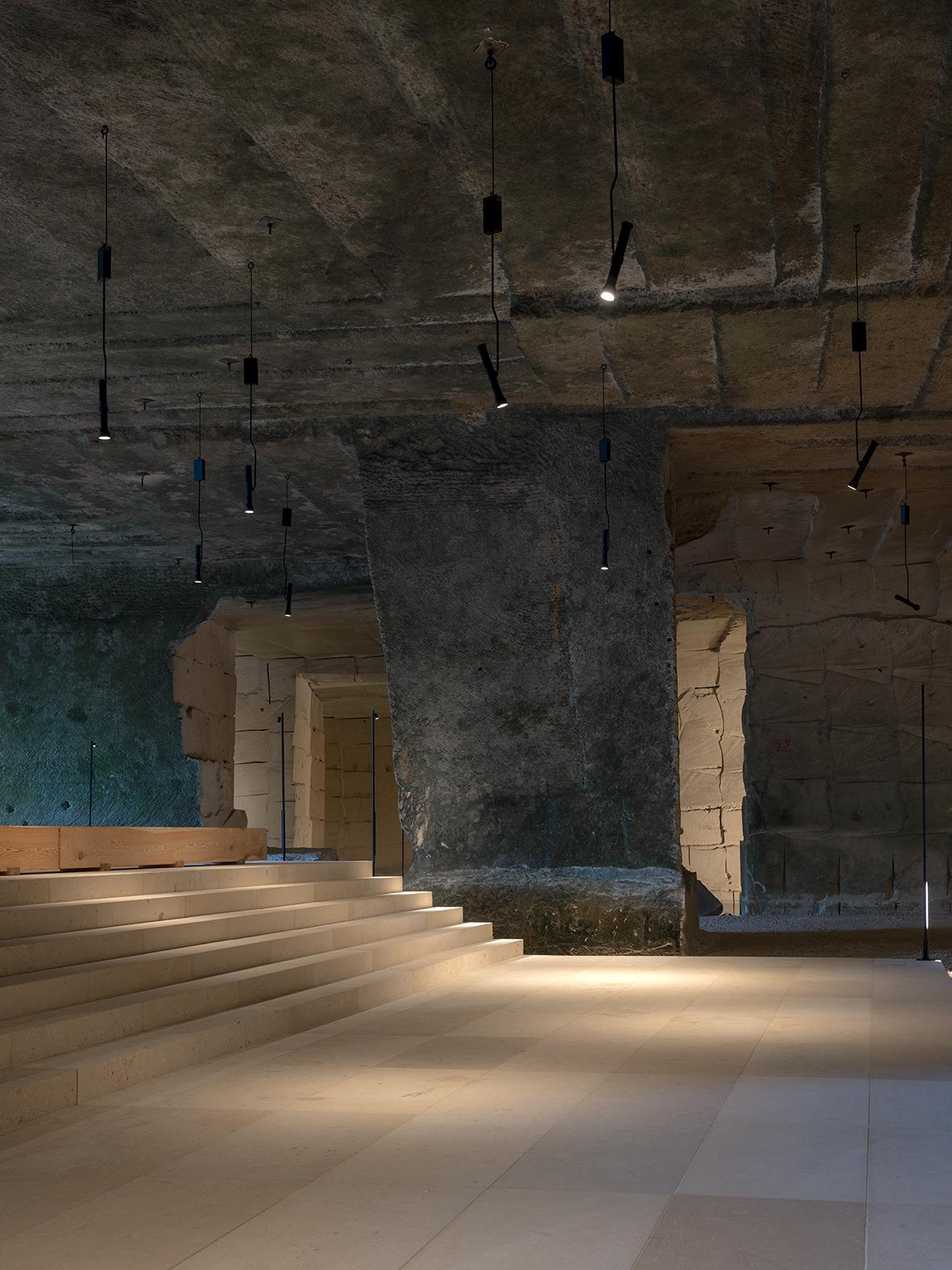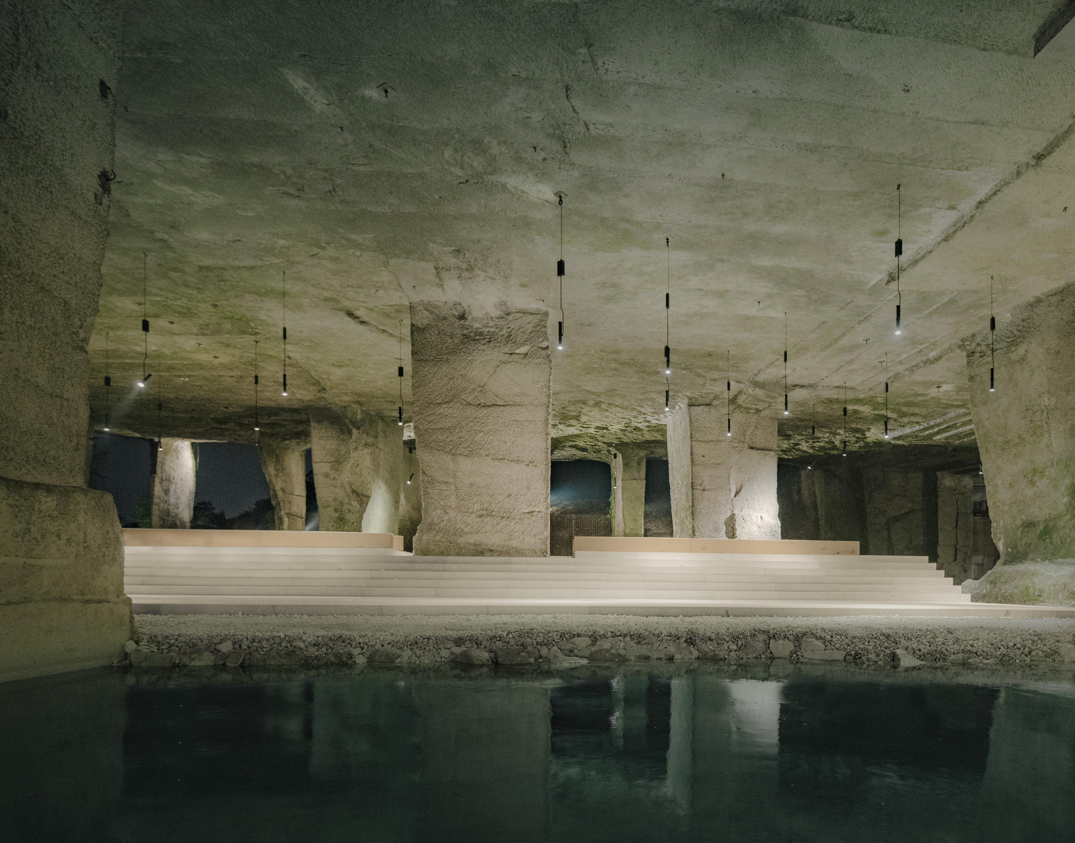 The caves were formed over six decades of quarrying, leaving behind a vast cavern supported by massive stone piers and partially filled with water. This natural yet man-made environment has become the stage for a unique architectural intervention where nature and architecture coexist seamlessly.