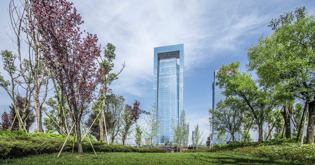 CCCC International Center in Chengdu blends office, hotel, and commercial spaces with nature, creating a dignified, iconic, sustainable city landmark.