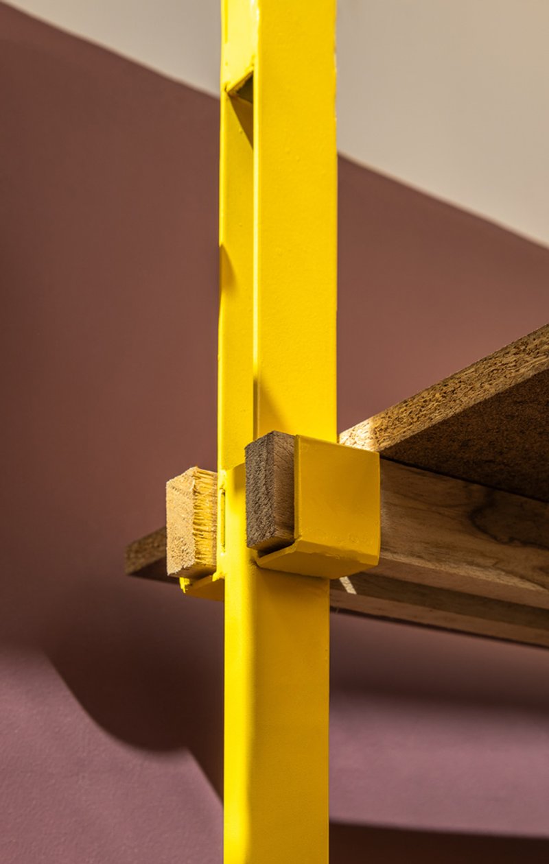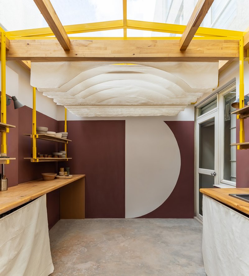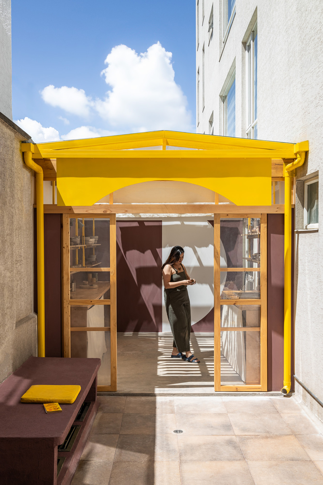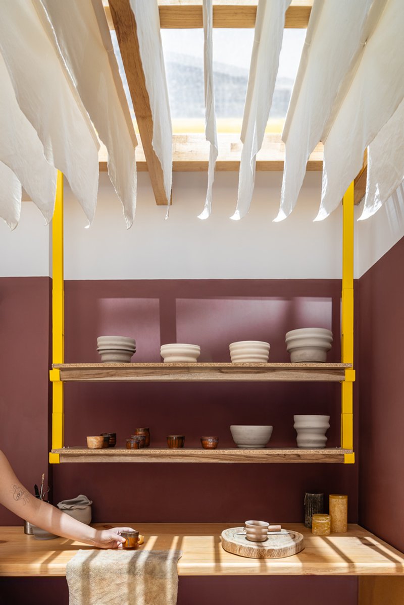 The shelves along the façade integrate yellow metal accents with pine wood, creating a functional yet warm display and storage system that complements the ceramic practice. Together, these elements merge architectural clarity with handcrafted charm.