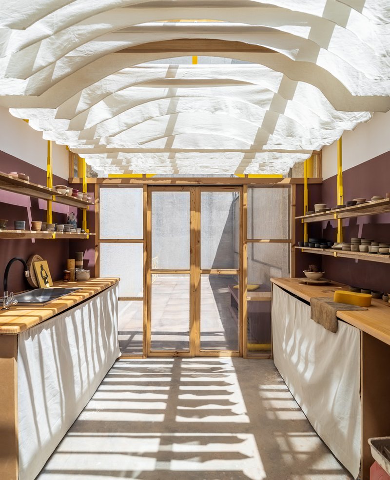A defining gesture is the introduction of a spherical geometry between the pergola and the floor plane. This circular radius shapes the fabric shades into a soft dome, echoing classical architecture and adding a sense of ceremony to the workspace. The curve reappears on the rear wall and façade, unifying the composition and framing the potter’s wheel, which sits at the heart of the dome-like volume.