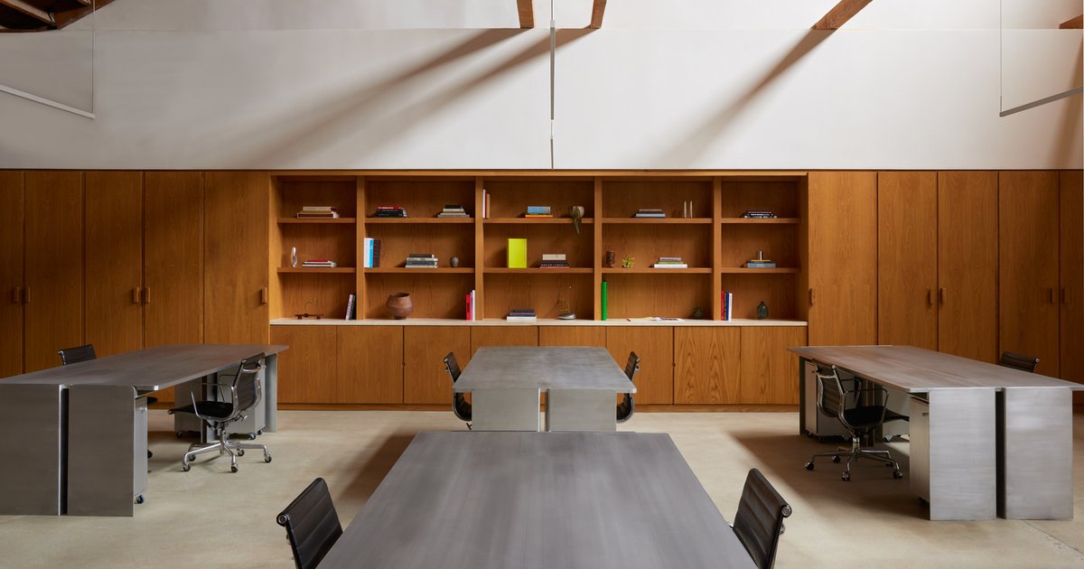 The heart of the office features an open-plan communal workspace with six custom aluminum workstations and Eames Management chairs, set against exposed wood rafters and concrete flooring. Bespoke oak and walnut millwork introduces a refined counterpoint to the raw industrial shell. At the center, a freestanding dark-stained white oak volume houses both a conference room and a dedicated listening room.