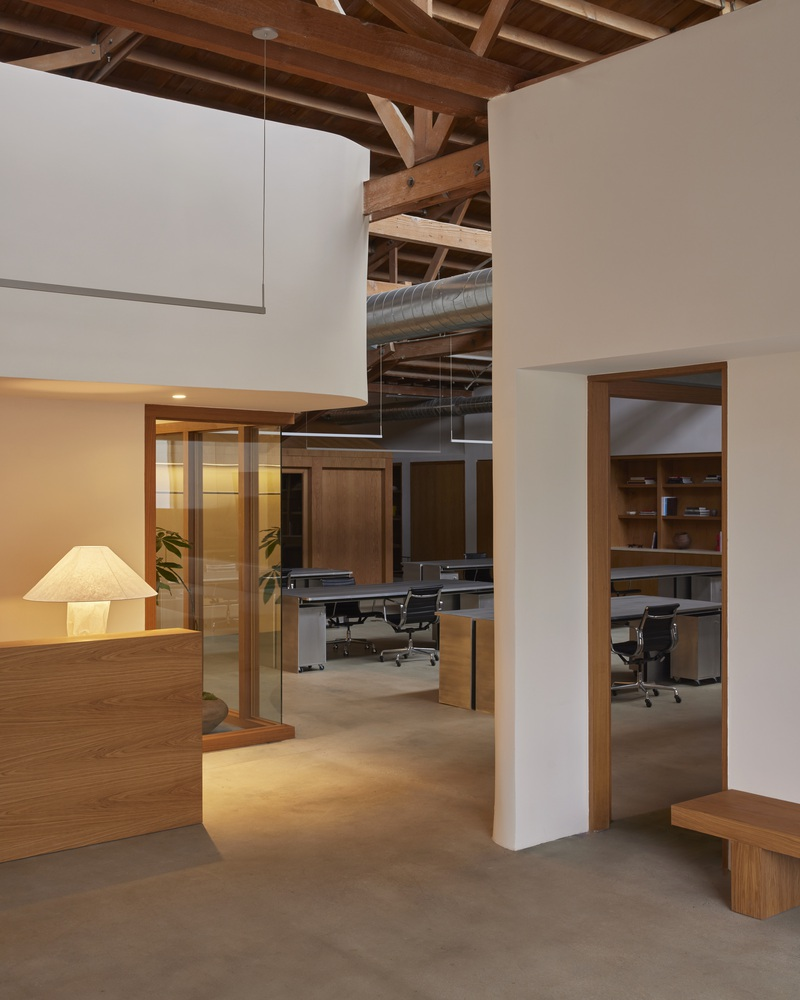 The headquarters design prioritizes material richness, spatial flow, and functional versatility. Upon entering, visitors are greeted by a custom white oak reception counter and matching bench set against concrete floors, balancing industrial grit with organic warmth. A sculptural Ingo Maurer Lampampe lamp and curated floral arrangements establish a moody, refined tone that resonates throughout the interiors.