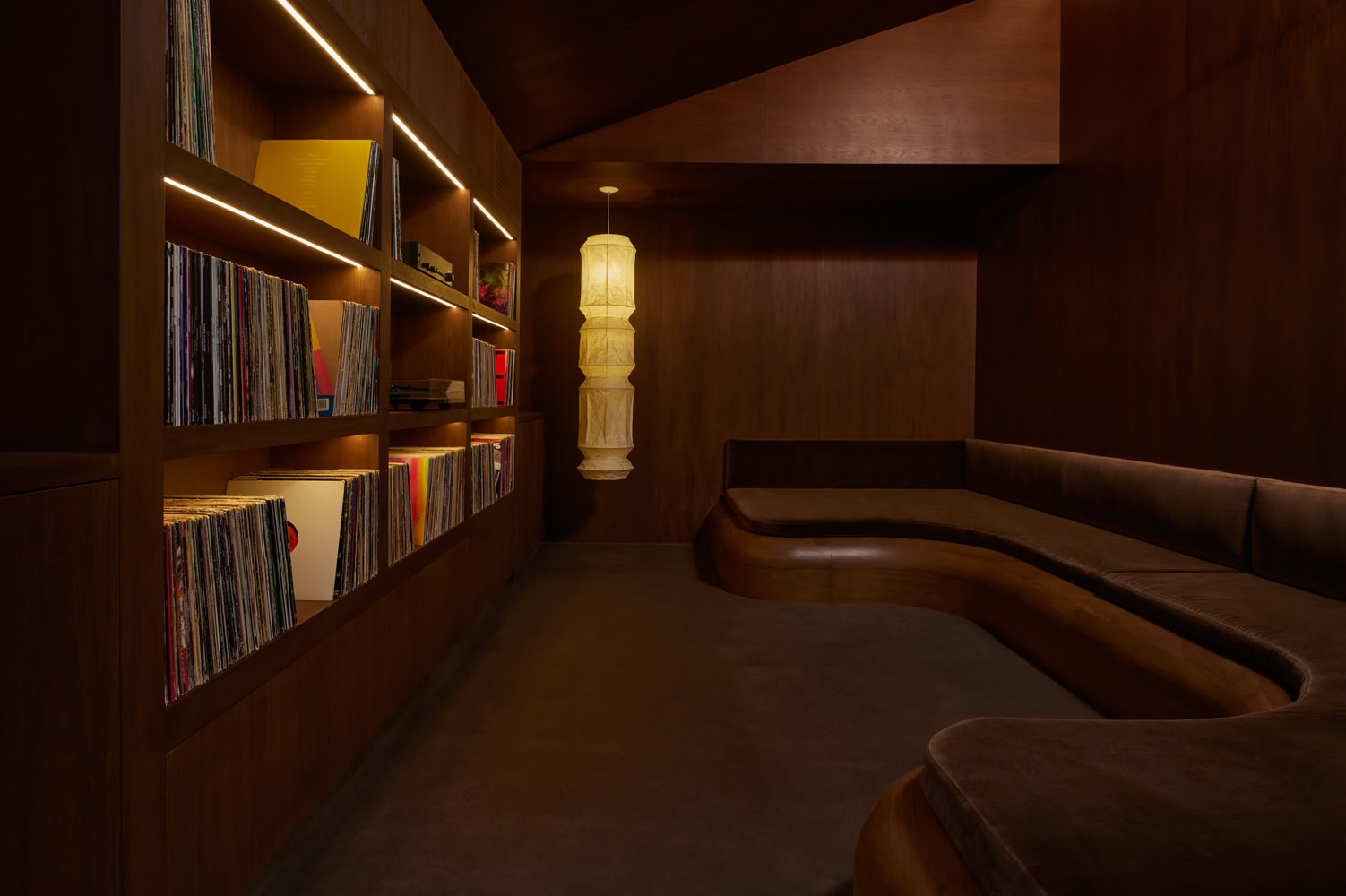 The conference room blends a burl wood Deco-inspired table with Pierre Jeanneret chairs, while the listening room is enveloped in walnut and velvet, featuring a six-foot custom sofa and an Akari floor lamp. Carefully angled acoustic ceilings ensure exceptional sound quality, creating a sanctuary for immersive music experiences on vinyl.