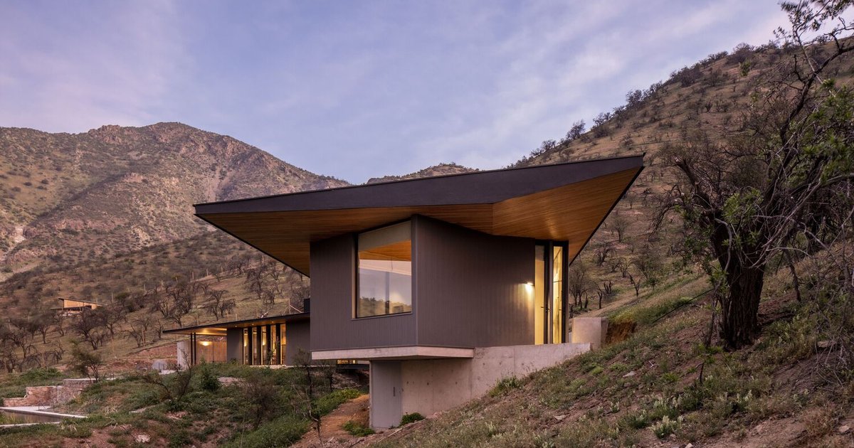 The Chamisero House was conceived with a strong desire to be in direct contact with the land. Its owners requested a design that would respect the natural terrain and minimize disruption to the steep slope of the hill. The architects responded by creating a linear design that seamlessly crosses over the land, linking the hills together through a bridge that spans a small creek. The result is a house that sits comfortably on the hillside while offering expansive views of the surrounding valley, mountains, and distant hills.