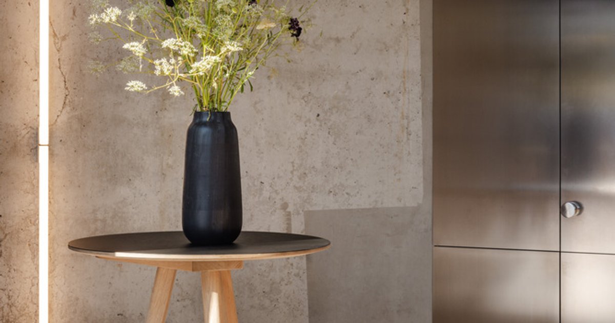 The seating area features simple, durable furnishings that resonate with the overall minimalist aesthetic. The honest expression of materials, from exposed concrete to warm wood, establishes a grounded yet inviting atmosphere ideal for daily visits.