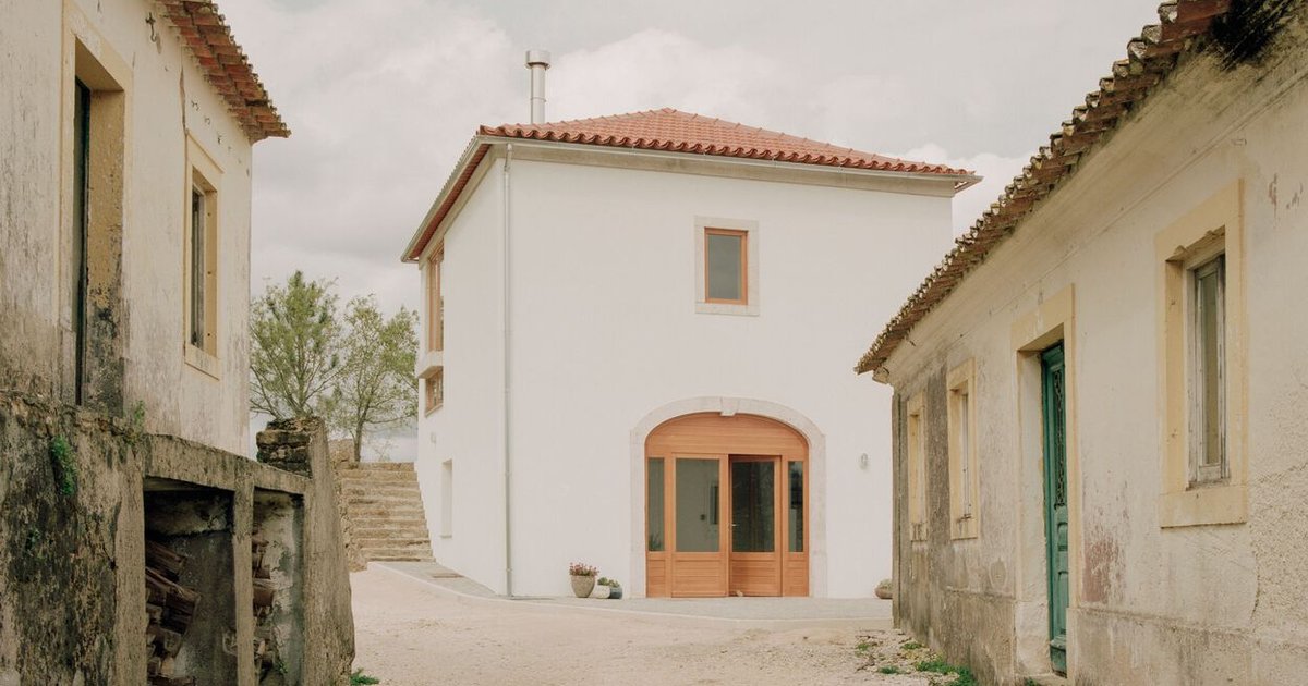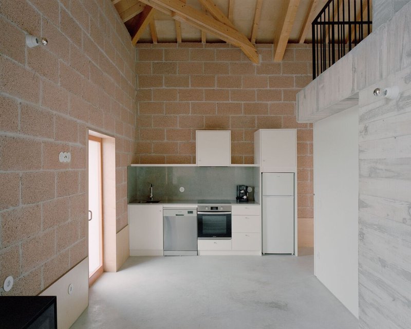 A sustainable renovation in Portugal, transforming a historic barn into hemp-block lodgings, blending exposed traditional and contemporary materials.