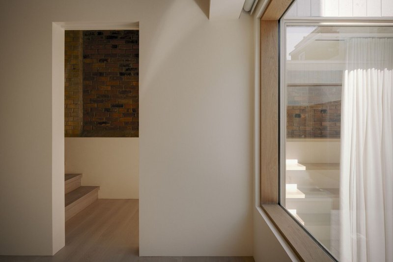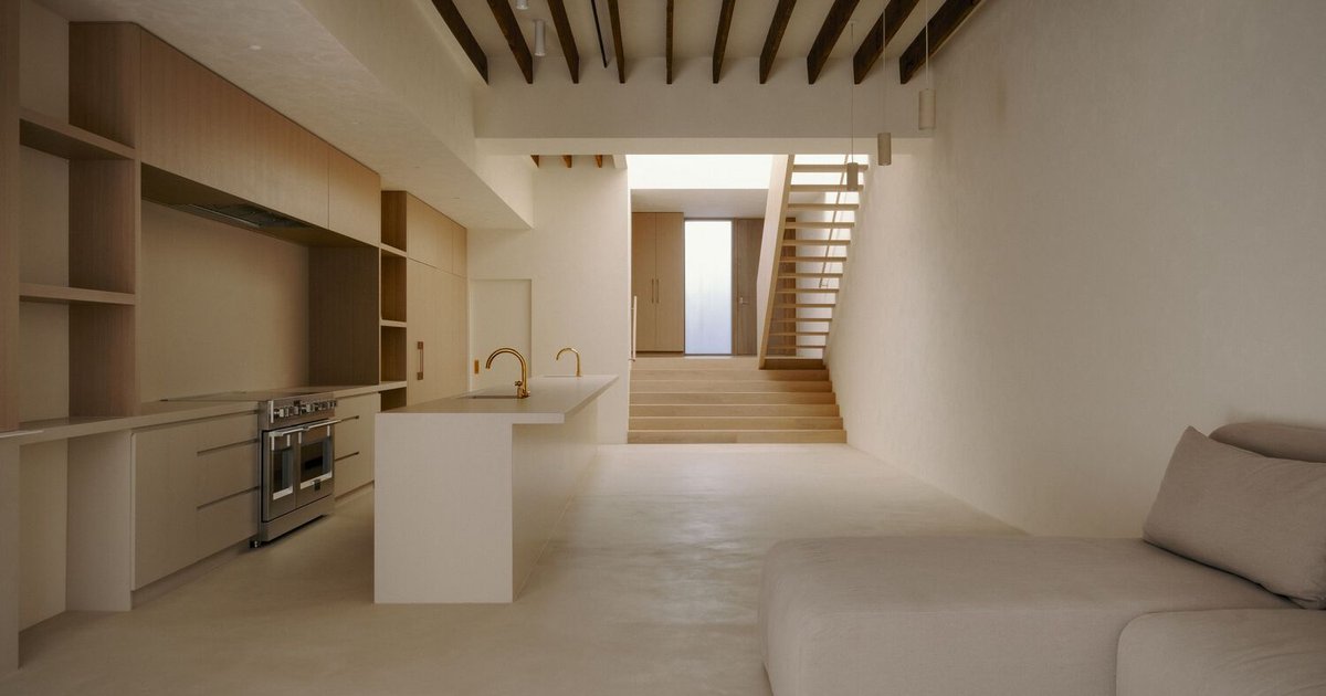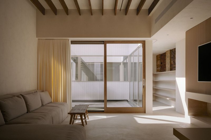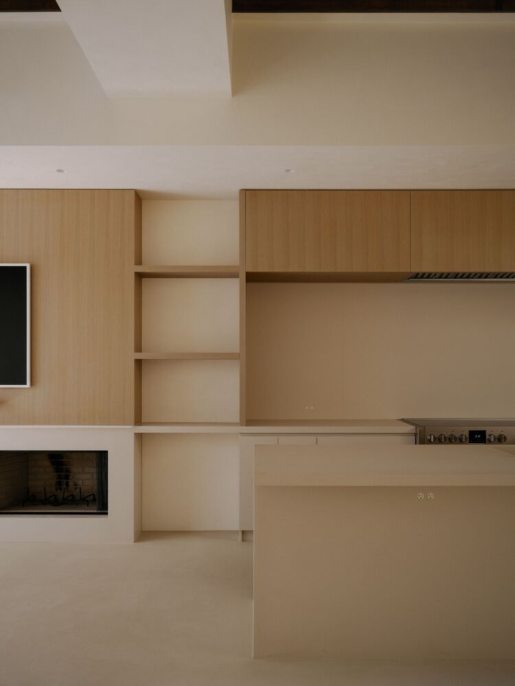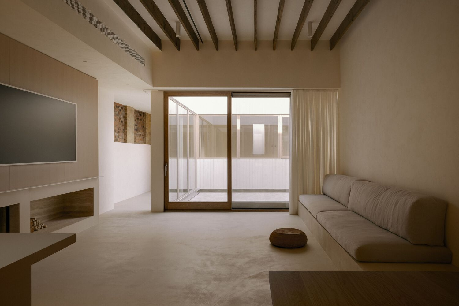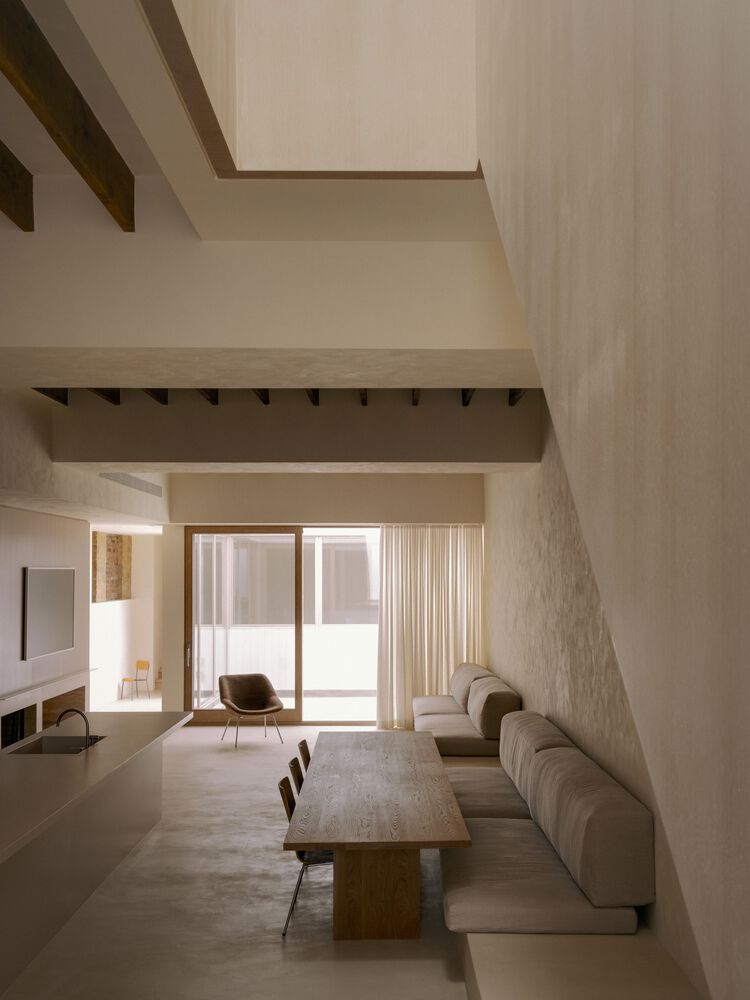 Limewash paint and microcement walls create a soft, matte finish that enhances shadows and diffuses natural light. Original brickwork and exposed beams are retained, not only as structural necessities but as historical artefacts, grounding the contemporary renovation in its past. The interior becomes a canvas for light and time, rather than an exhibition of materials.