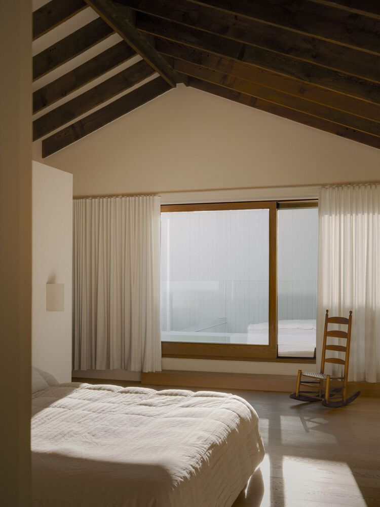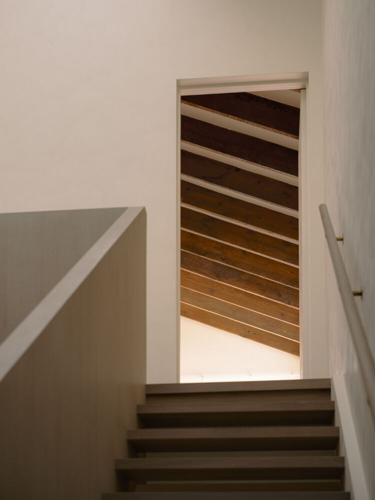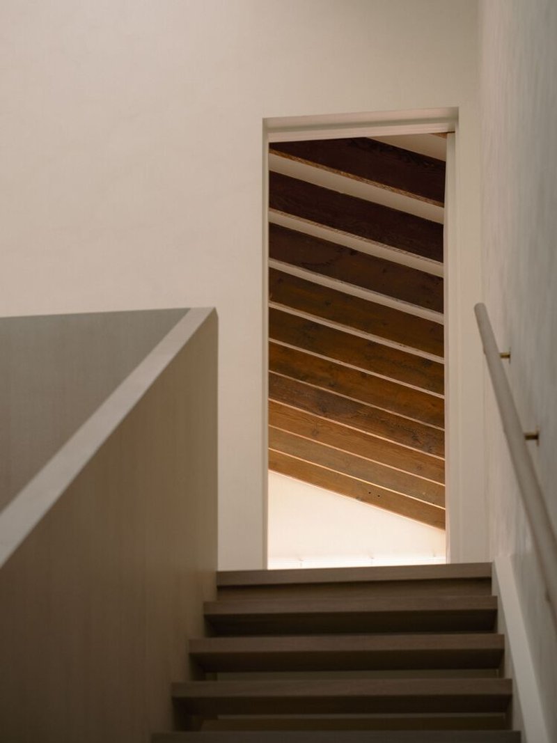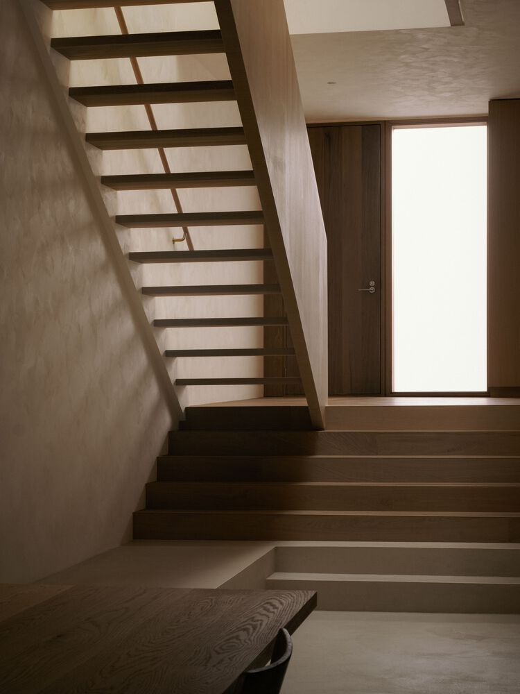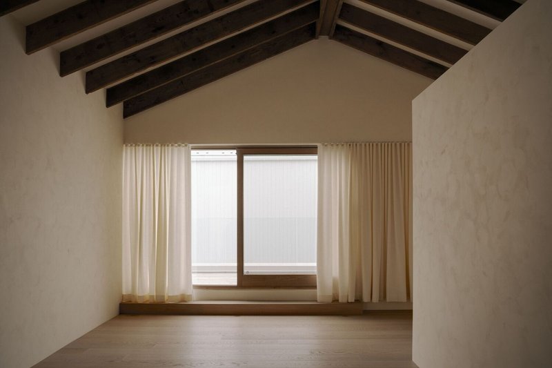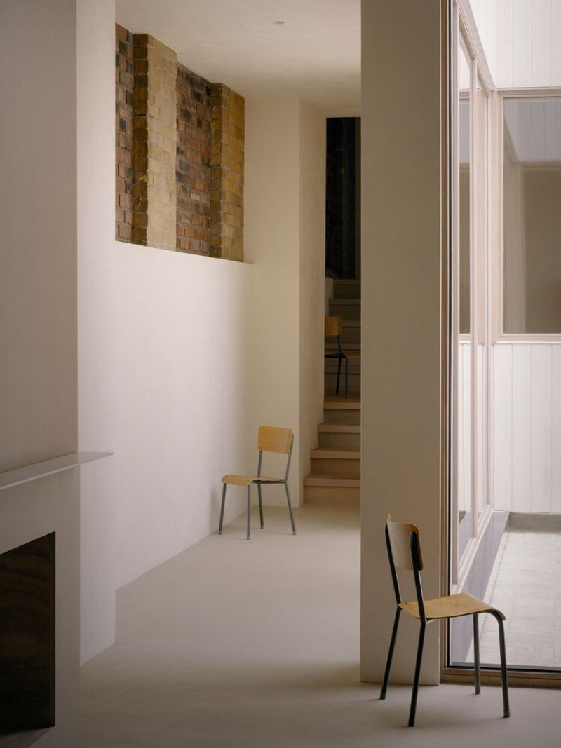 Limewash paint and microcement walls create a soft, matte finish that enhances shadows and diffuses natural light. Original brickwork and exposed beams are retained, not only as structural necessities but as historical artefacts, grounding the contemporary renovation in its past. The interior becomes a canvas for light and time, rather than an exhibition of materials.