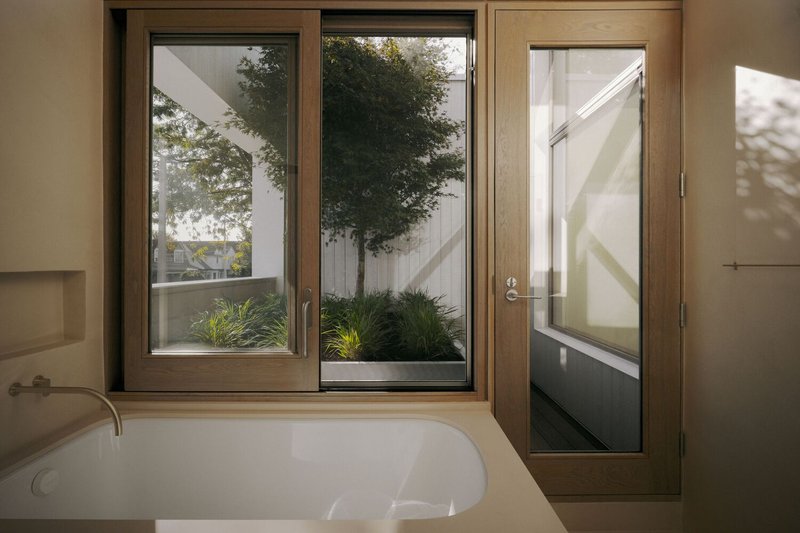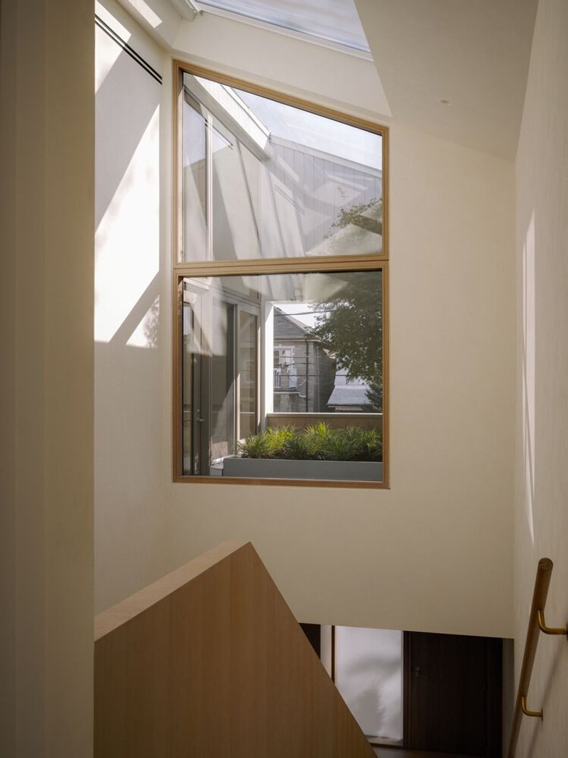 The home’s dramatic centerpiece is a double-height atrium, which begins near the entrance and floods both levels with light from above. This atrium connects residents to the time of day and weather patterns—turning light into an architectural material. A skylight and large window above introduce a warm cascade of sunlight, while a Japanese maple planted in the adjacent courtyard provides dappled privacy and seasonal variation.