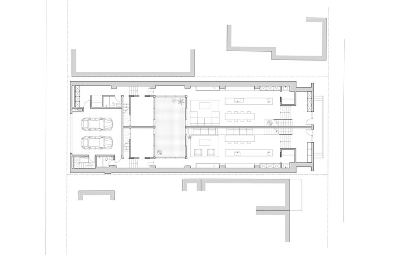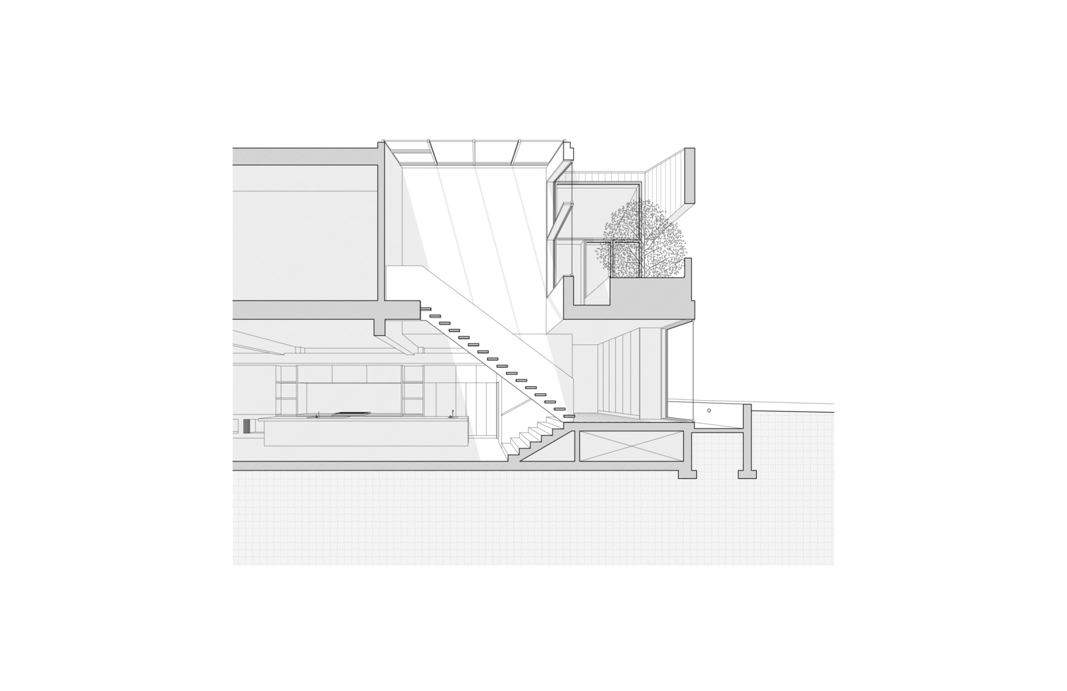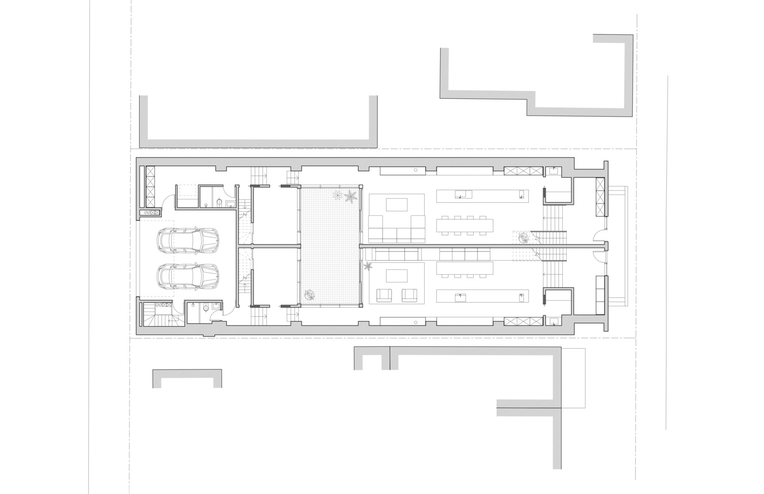 Located slightly below street level, the home feels both protected and discreet. The site, which spans the full depth of the lot, allowed StudioAC to strategically carve out generous spaces that bring light deep into the building's interior. This transformation maintains the structure’s essence as a gathering space, adapting it to modern family life while preserving its spiritual undertones.