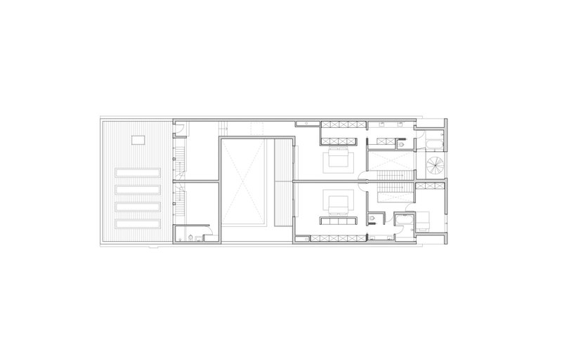 At the heart of the plan lies a central courtyard, the spatial anchor that defines circulation and function. By removing select portions of the original church structure, light now penetrates the deepest sections of the home. StudioAC retained the exposed steel framing and original wood beams as part of a sustainability-forward approach that reduced waste and emphasized the historical character of the building.