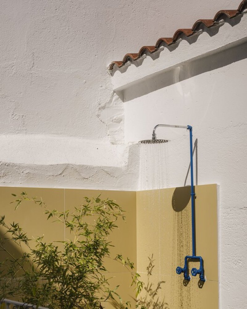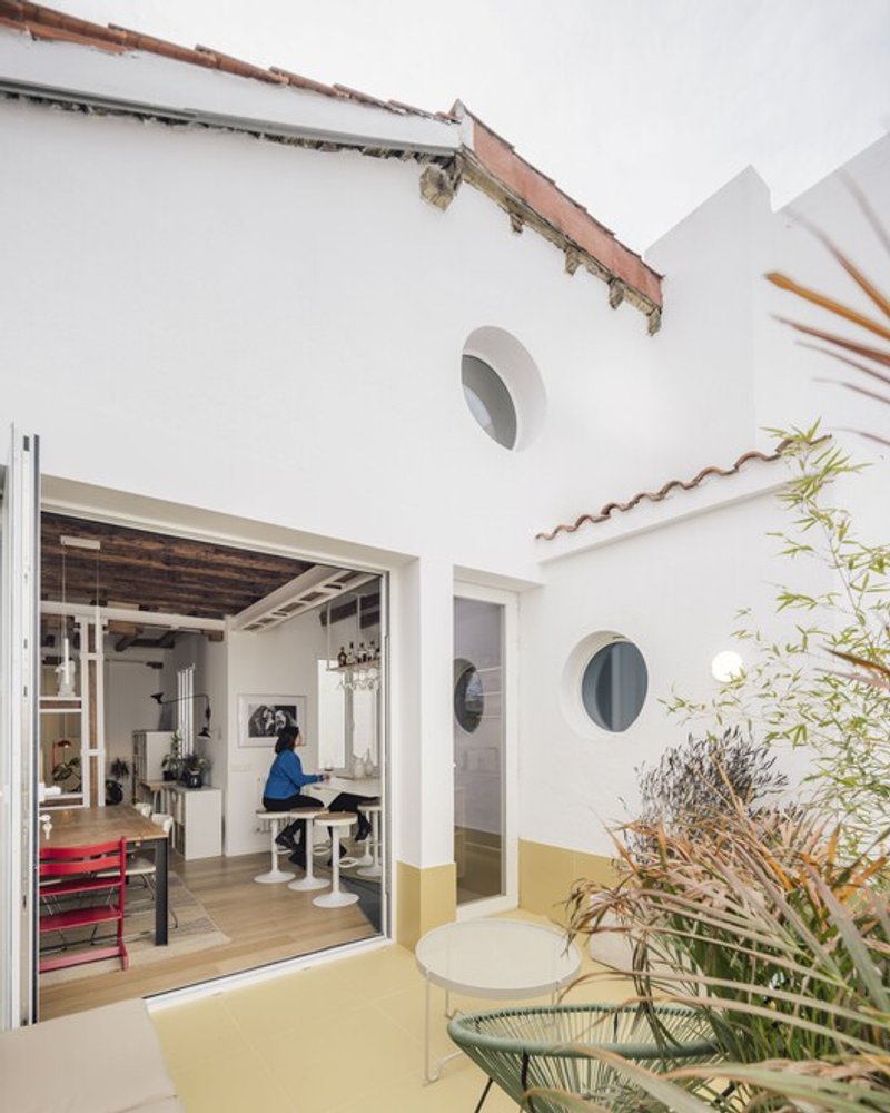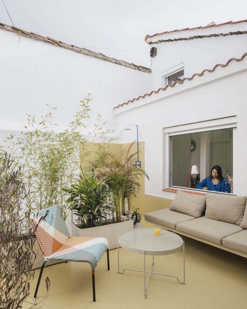 At the farthest end of the 21-meter-long home lies a 15 m² terrace, the apartment’s most extroverted moment. Together with the skylights, it floods the interior with daylight and becomes a seasonal gathering place—complete with a small jacuzzi for winter and summer use.