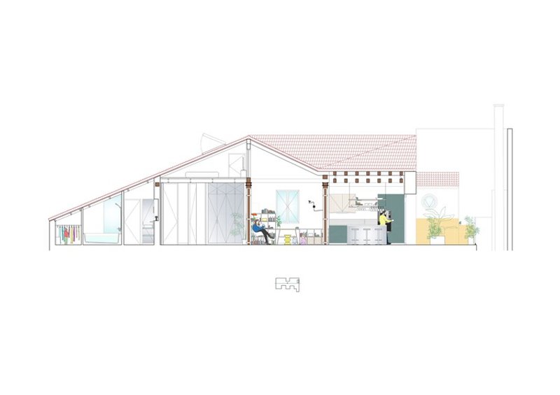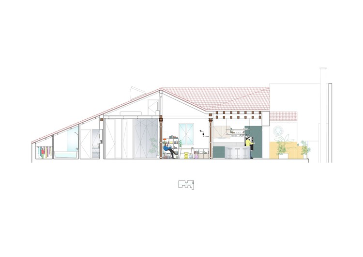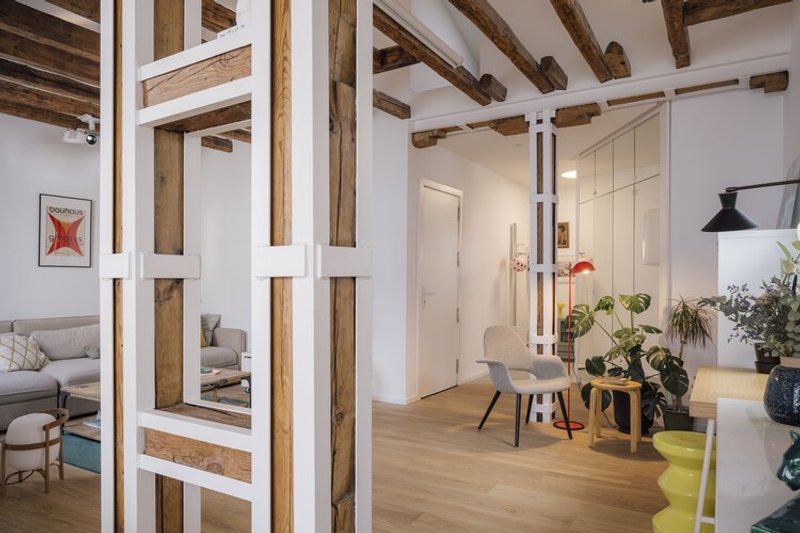 Despite its top-floor location, the dwelling originally lacked meaningful connection to the city or its skyline. Its defining feature was an enormous undulating roof composed of seven slopes, supported by a web of aging wooden beams and concealed behind a low false ceiling. What might have been a limitation became the project's conceptual engine: the house would be redesigned through the roof.