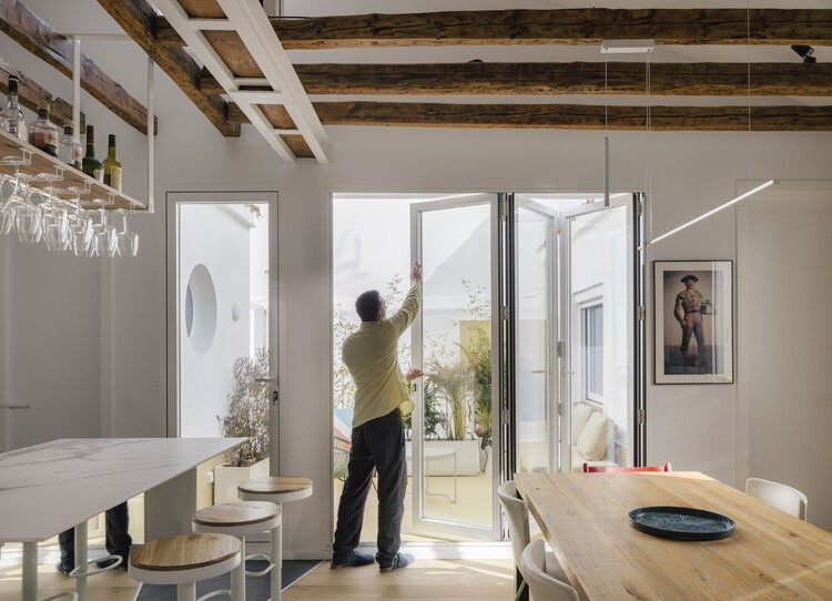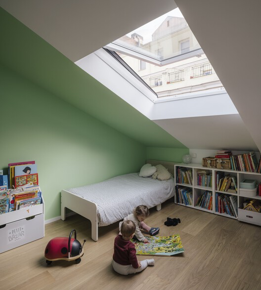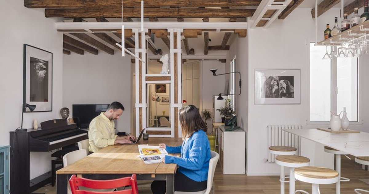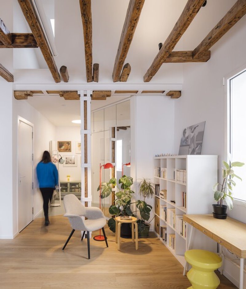 A Madrid penthouse transformed into a luminous, sky-oriented interior where exposed beams, skylights, and fluid spaces redefine contemporary family living.
