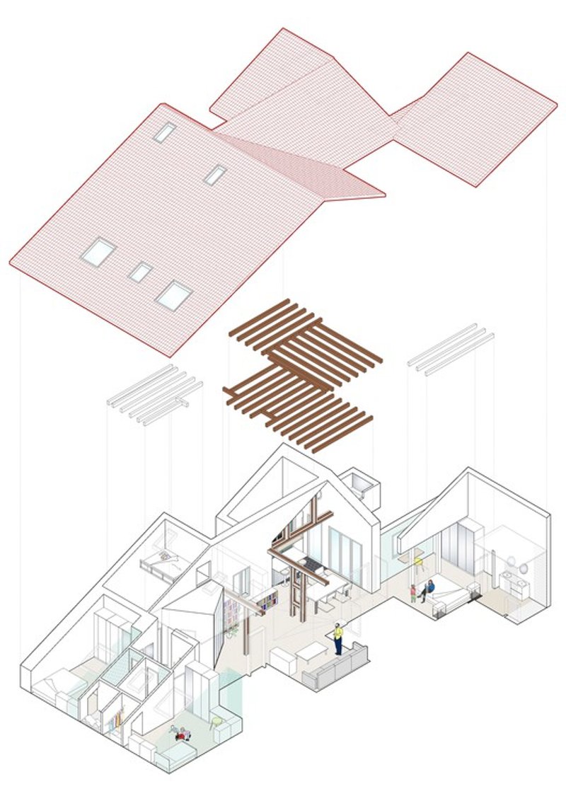 Inside, the ceiling’s sloping planes and exposed beams create the sensation of inhabiting a crafted interior terrain. The roof is not merely a shelter but a defining architectural volume, shaping the experience of every room.