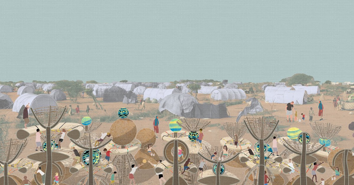 A modular system is needed for the adaptation of the various site conditions in the refugee camps. This design reimagines the modules to be components on columns. First, wooden columns of 2 to 4 meters tall are erected, and then circular elements, such as spheres, cones, disks, and torus, are mounted on the columns. creating totems of concentric circular elements. Different from an ordinary modular system, these columns do not physically connect or form a 3D grid. Instead, they are placed 2m apart from each other in any direction, which creates a zig-zag negative space between them. It is difficult to climb up one column on its own, but it is much easier for children to climb among columns.