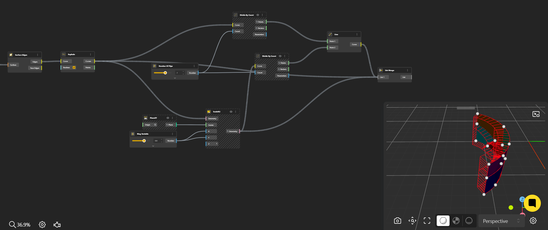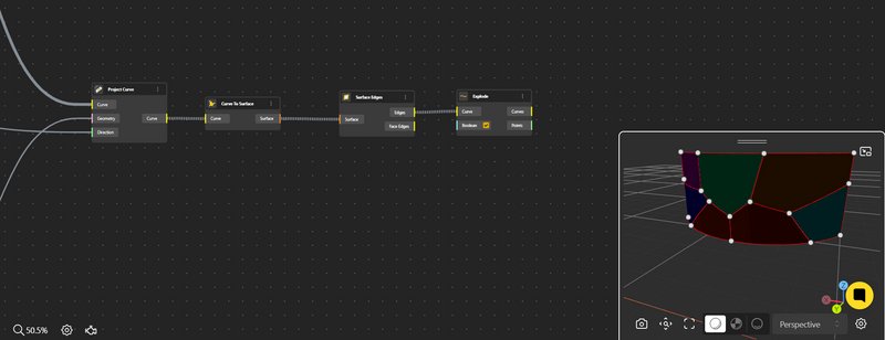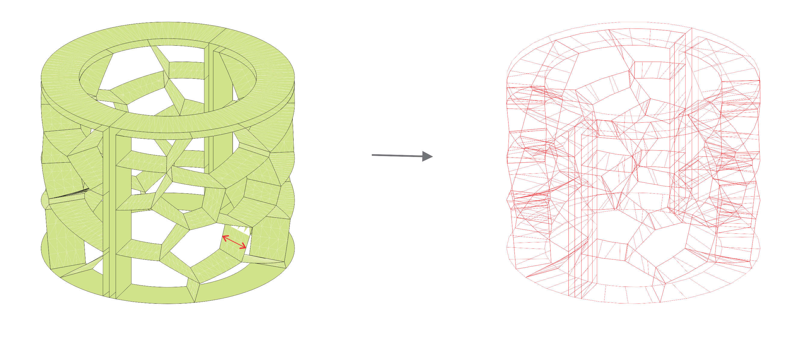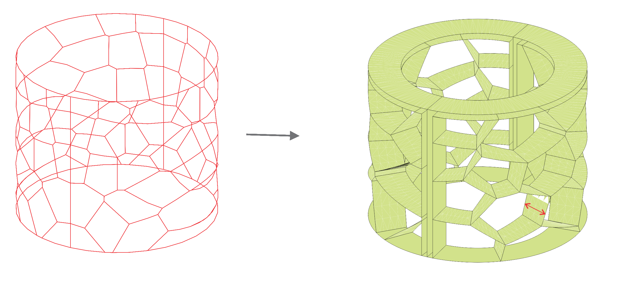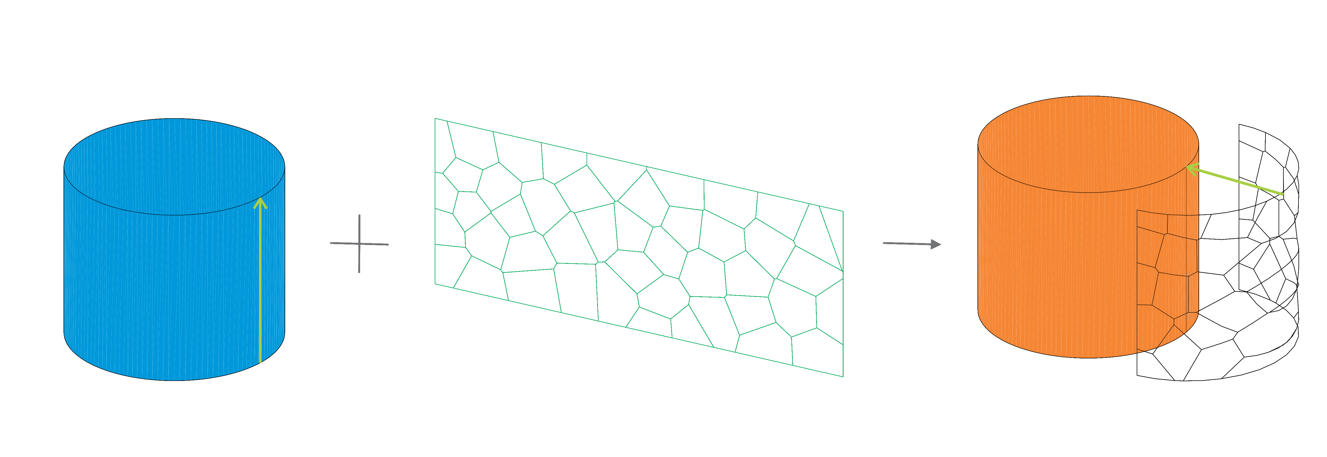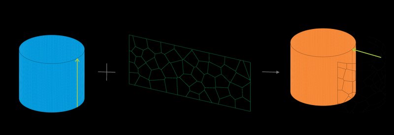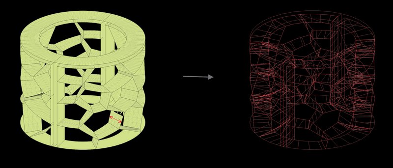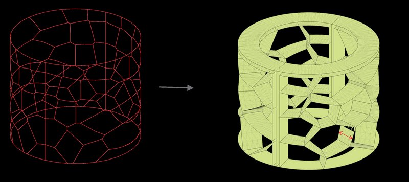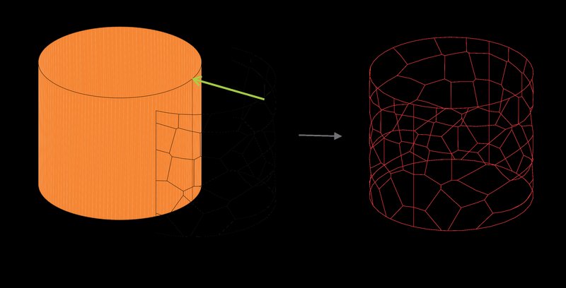To generate the Voronoi cells, we began by creating a rectangular surface placed in front of the cylinder. This allowed for a simpler application of the Voronoi algorithm. Once the Voronoi pattern was generated on the rectangular plane, the lines were projected onto half of the cylinder's surface, ensuring a seamless integration with the cylindrical geometry