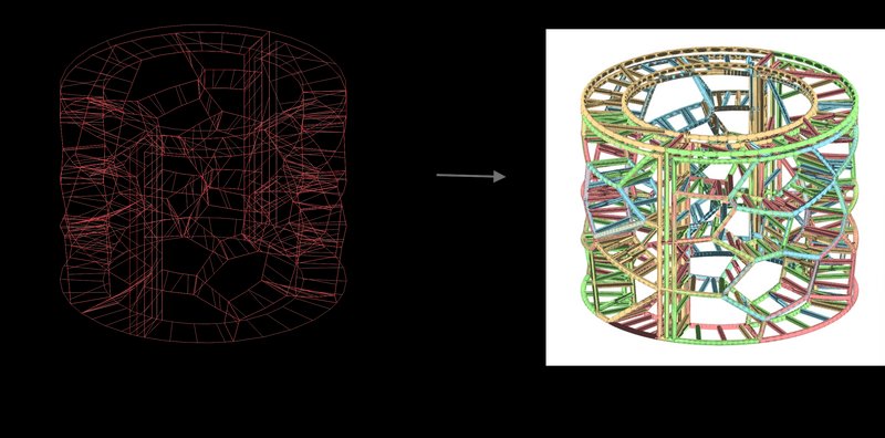 To bring CIRVO to life, the design is intended to be fabricated using hollow pipes that are welded together at varying angles. The Voronoi lines projected onto the cylindrical surface serve as the guide for cutting and bending the pipes. Each pipe represents one edge of the Voronoi cells, creating a lightweight yet structurally sound frame. By welding the pipes at different angles corresponding to the extruded Voronoi heights, the irregular forms are achieved while ensuring stability. This approach not only highlights the geometric complexity of the design but also makes the structure durable and feasible for urban use.oronoi heights, the irregular forms are achieved while ensuring stability. This approach not only highlights the geometric complexity of the design but also makes the structure durable and feasible for urban use