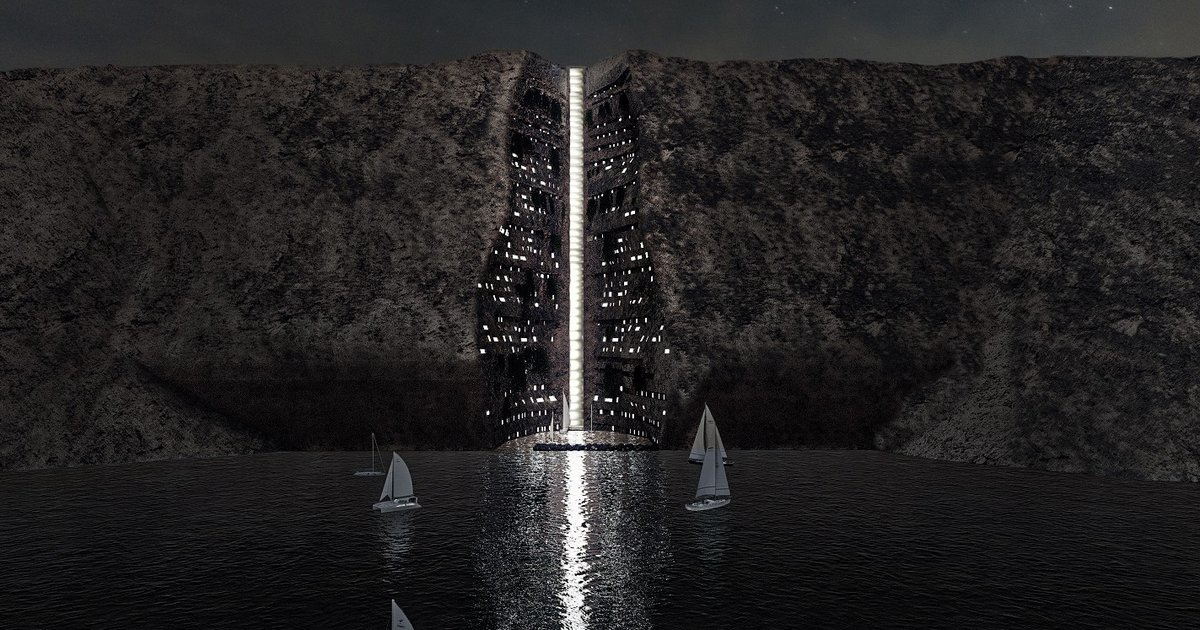Although Santorini is an island with a smaller area compared to cities, it is exposed to millions of tourists, especially as a result of its increasing popularity in social media. Especially in the summer season, the number of tourists increases every year, leaving the island under the effects of overtourism. Santorini must face the problems usually faced by big cities because it tries to meet the needs of more people than an island can handle. The constant structuring of the island to meet the accommodation needs of the tourists, puts large pressure on the mainland. Due to this situation, agricultural areas are gradually decreasing. In cliffscraper , we gather the structures planned to be built on the mainland in a single mass and suggest the cliffs of the island, as potential vertical life lands.This provides the opportunity to protect the remaining agricultural areas on the island. The slit, which is naturally formed in the cliff, creates the design boundaries. Thus, as the architecture emerges from the topography, we aim to minimize the huge gap between a skyscraper and human scale, not to create a level difference in the silhouette.