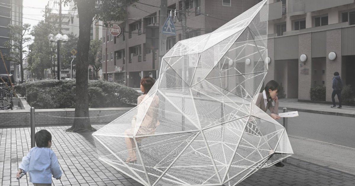 The structure is composed of triangular modules made of steel pipes and nylon wires. This modular approach allows flexibility in form, making it adaptable for future design developments. The woven nylon wires respond to human use—slightly warping when someone sits—providing comfort while enhancing the tactile experience of the furniture. The geometric pattern creates an interplay of light and shadow, amplifying its presence in the urban landscape.