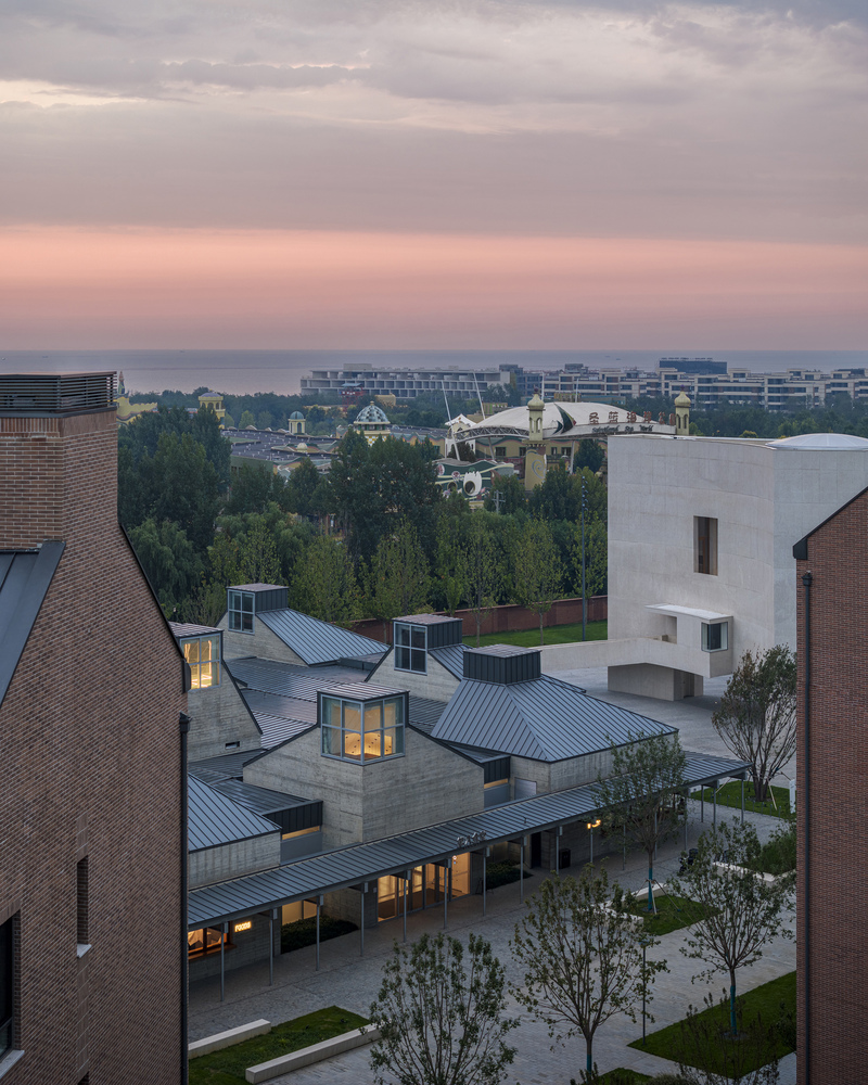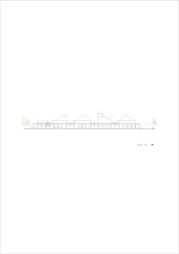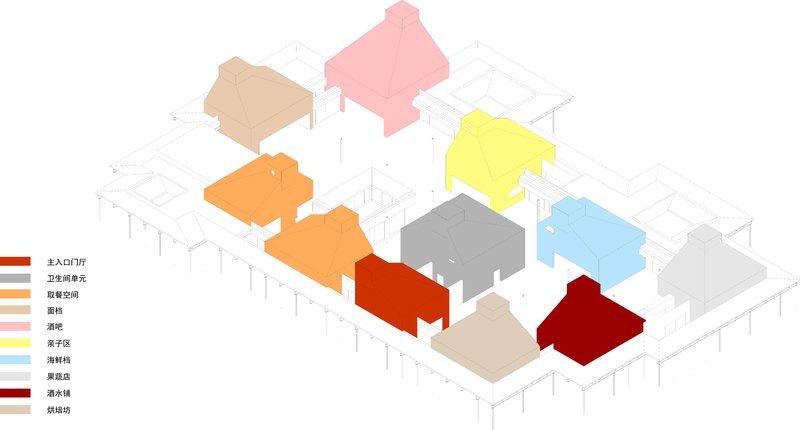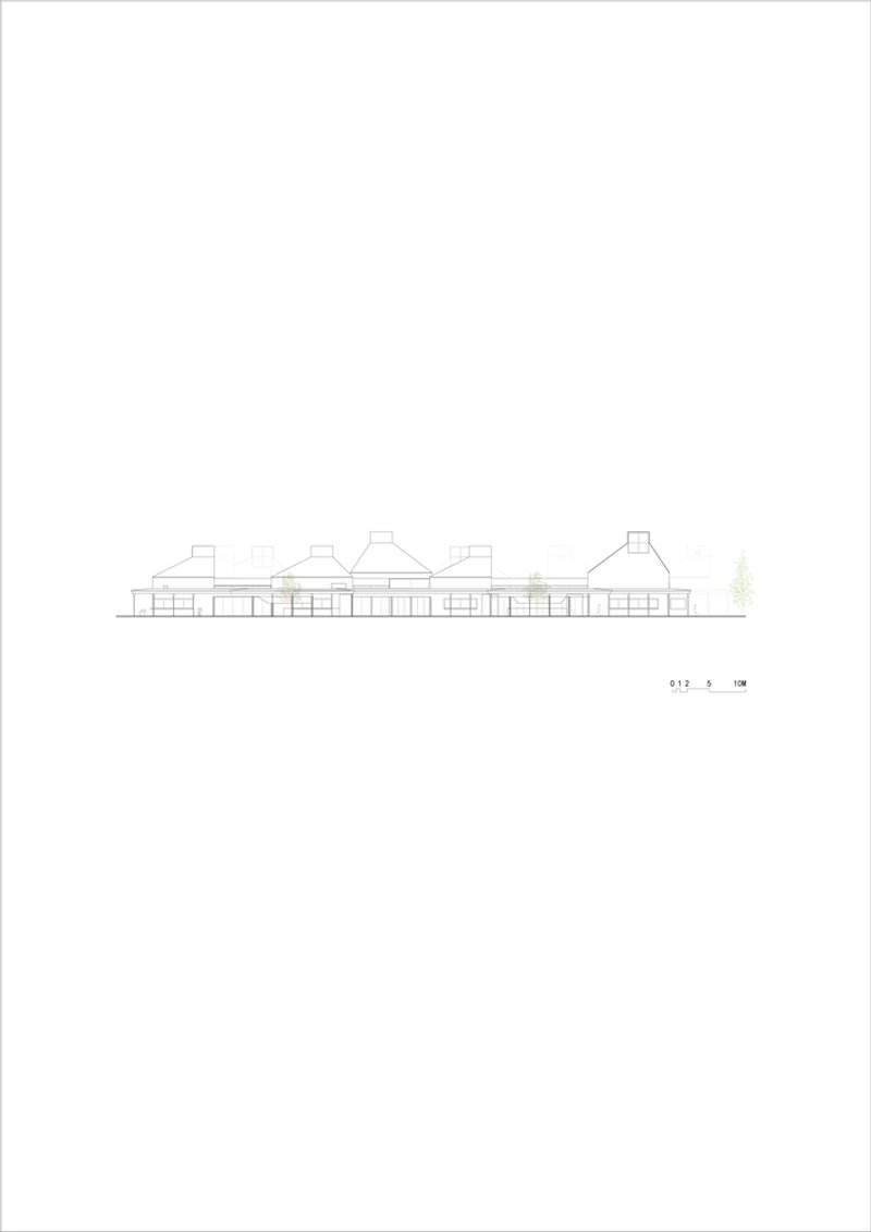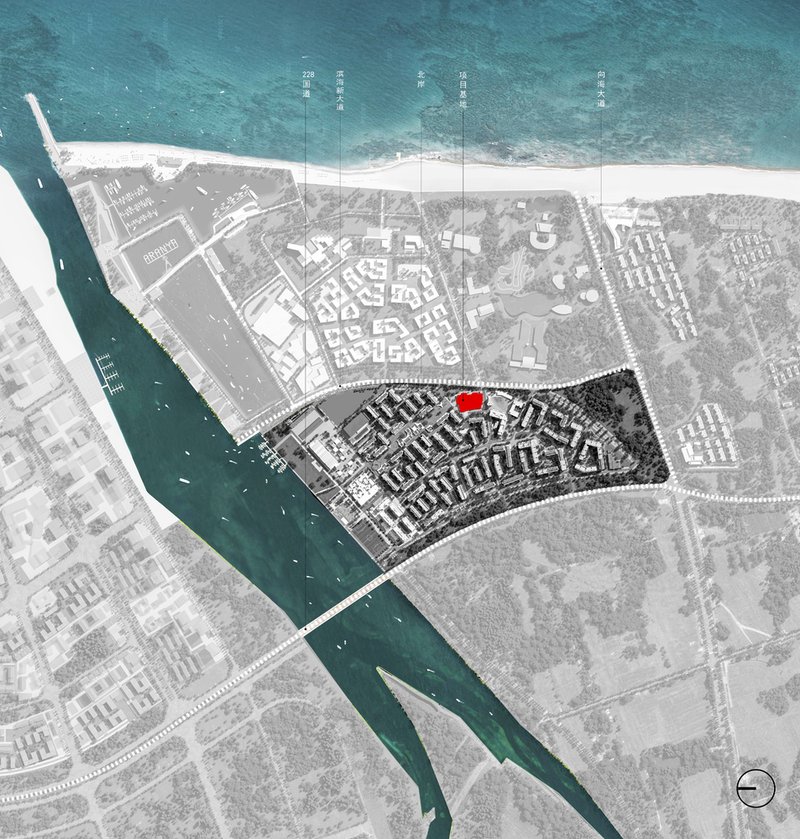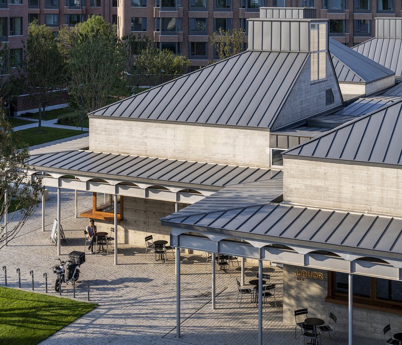 Situated in Qin Huang Dao Shi, China, the marketplace strategically minimizes obstruction of sea views while integrating seamlessly with the residential area. The design employs a flat, single-story structure to ensure low-profile visibility and minimize sight interference with nearby apartments.