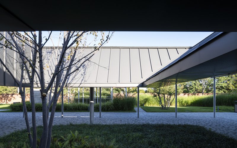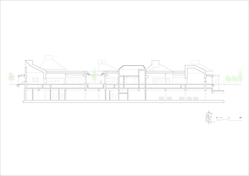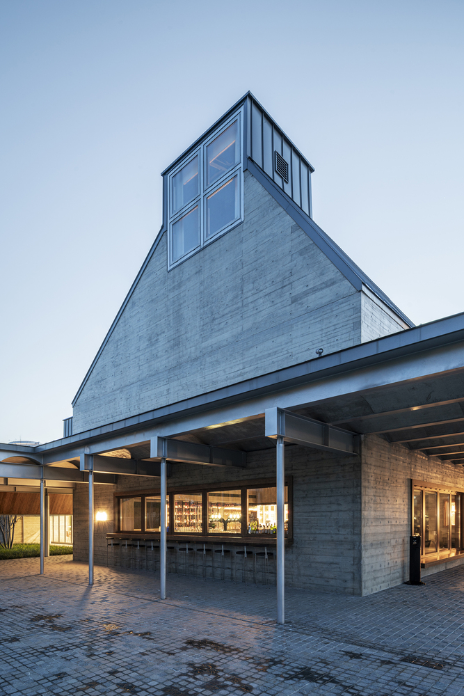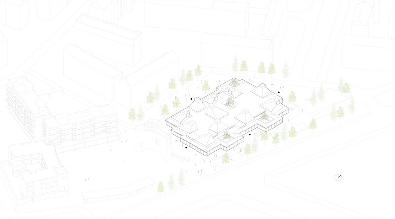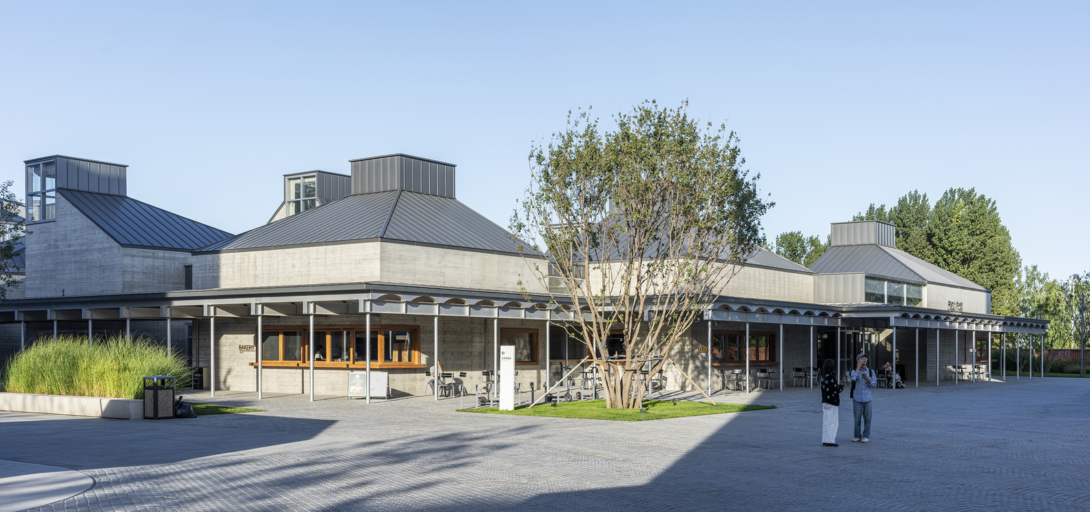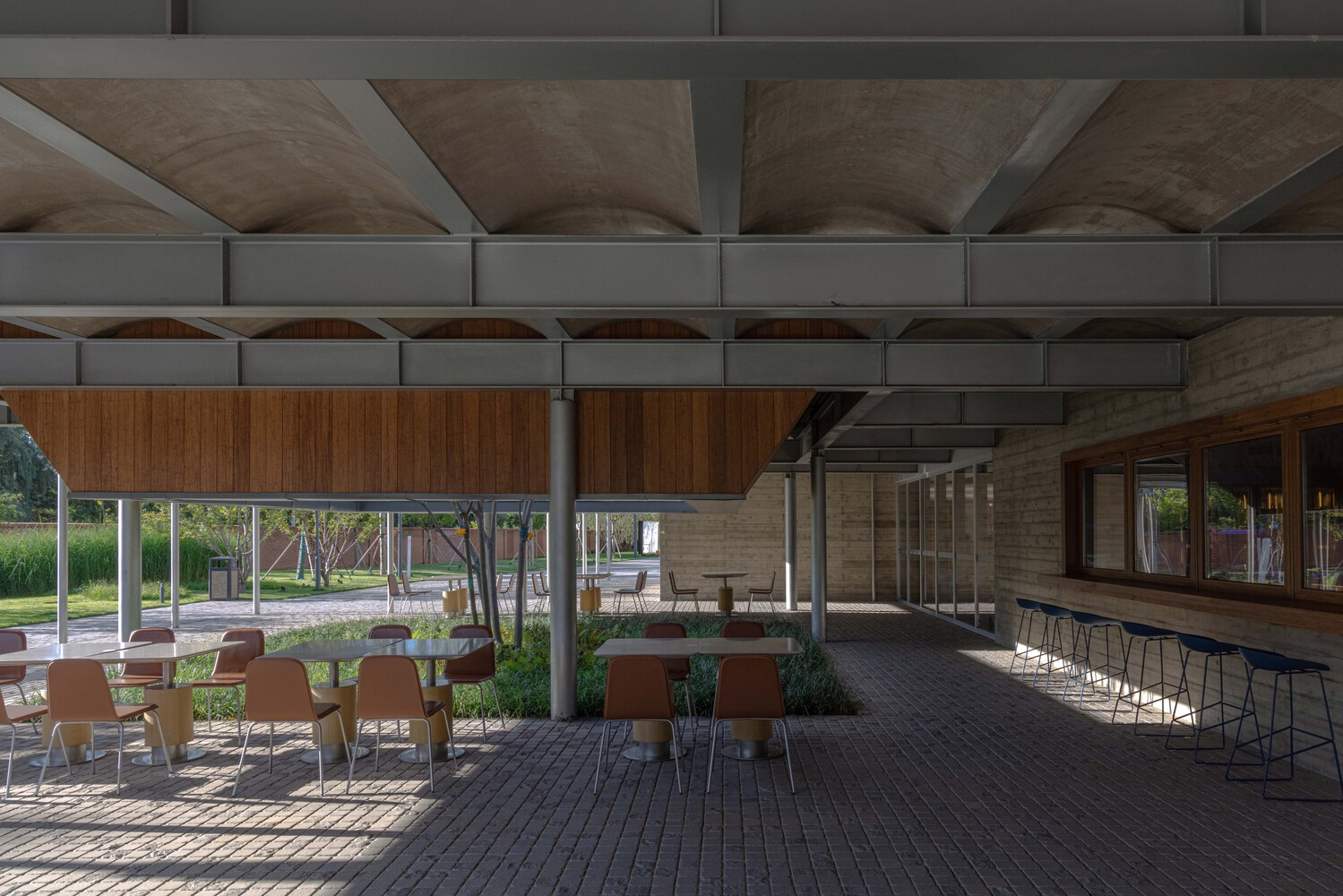 The design extends into a sinuous gallery that wraps around the marketplace, creating green courtyards and a continuous, welcoming interface with the park. This layout fosters a pleasant entry experience and accommodates outdoor setups, crucial for peak seasons and weekend markets.