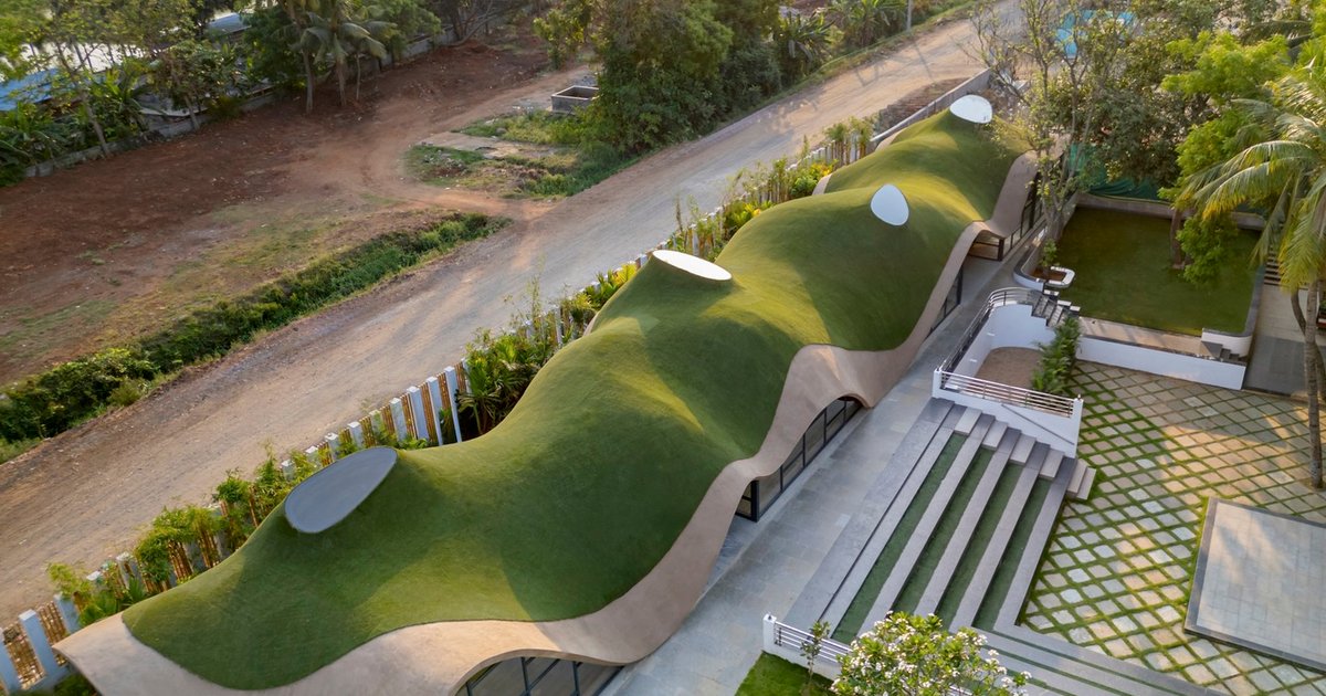 The most defining architectural gesture of the project is its curved, undulating roof, which resembles rolling hills or ocean waves when viewed from a distance. Covered in turf, the roof visually merges with the surrounding landscape, transforming the building into a green landmark within the campus. From afar, glimpses of the landscape beyond reinforce the illusion that the structure is part of the terrain itself.