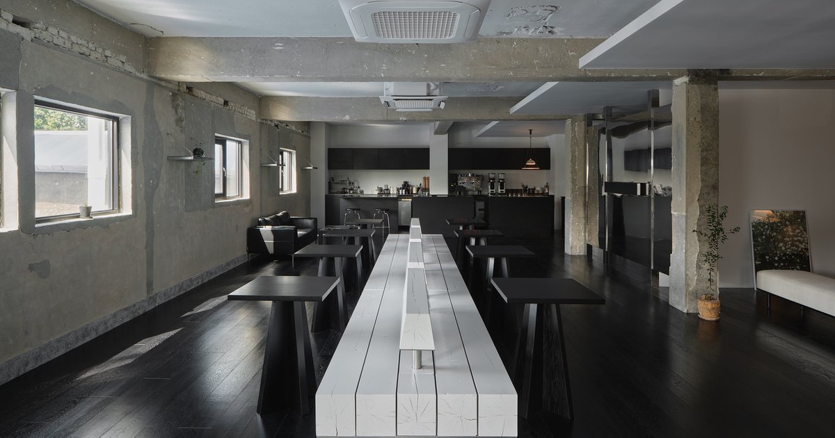 The café's custom-designed furniture plays a significant role in its overall aesthetic. Each piece carries a monolithic mass, embodying the principles of brutalist architecture. The long bench and oversized table, finished in contrasting warm hues, act as focal points that balance the otherwise cool material palette.