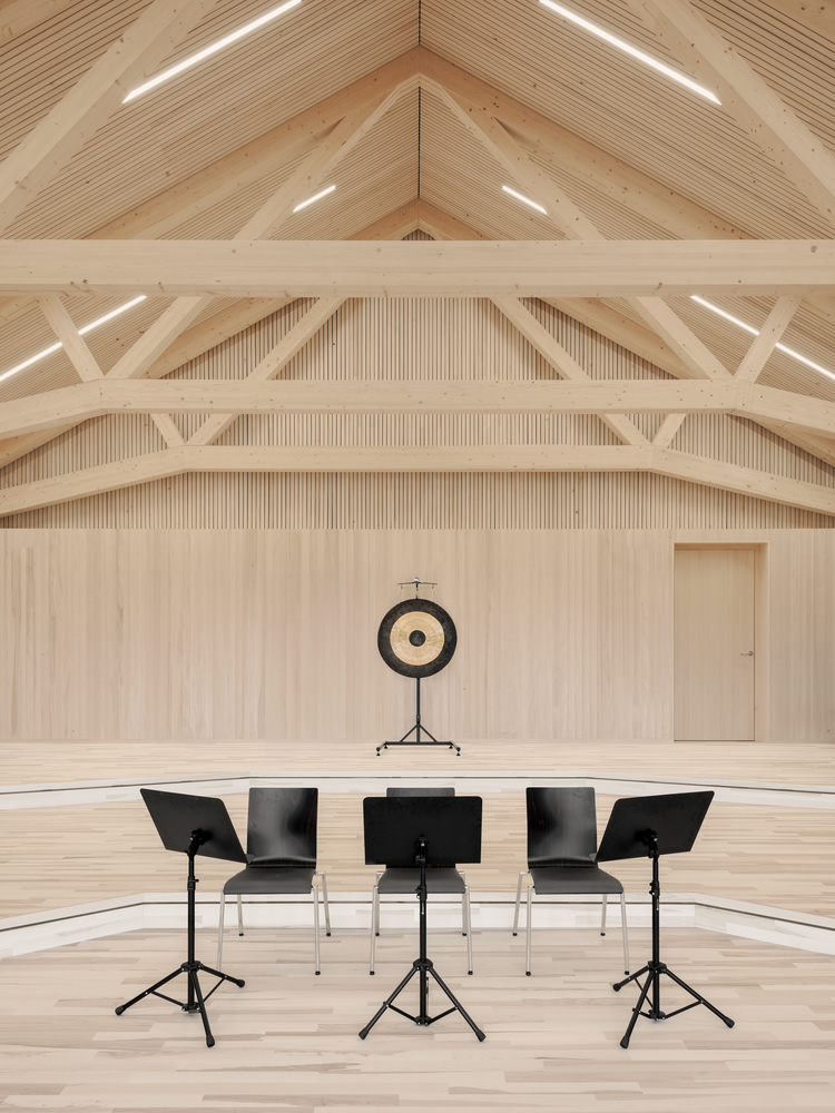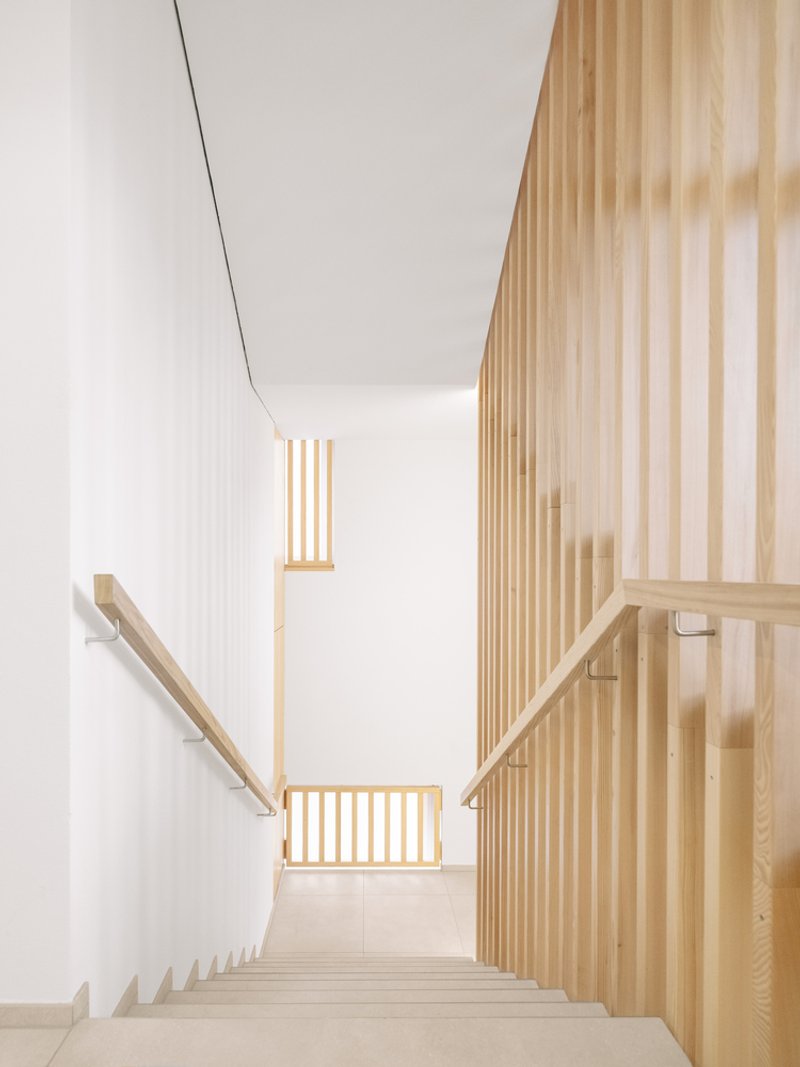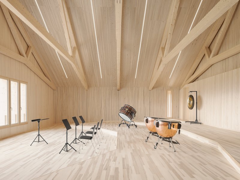 One of the project’s most distinctive architectural moves is the extension of the roof by one additional storey. This vertical strategy avoids land consumption and enhances the building’s presence within the village skyline.