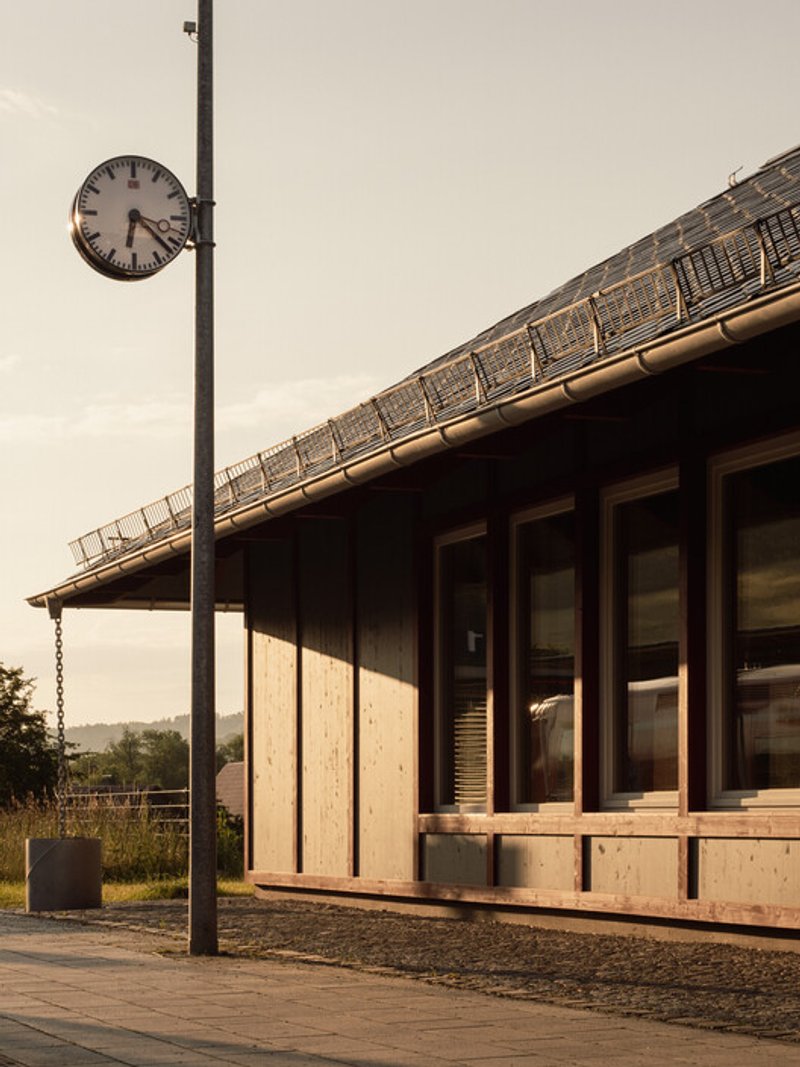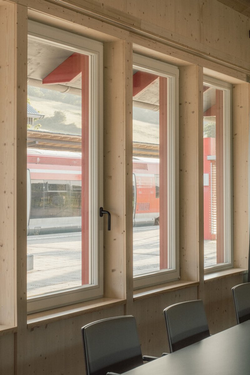 The building’s compact, largely closed volume with a low A/V ratio ensures optimized energy performance. Large roof overhangs shade the minimal glazing, preventing overheating in summer. The choice of locally sourced timber reflects sustainability, while prefabricated construction elements enhance economic efficiency. Combined with wood-fibre insulation boards, heavy roof insulation, and triple-glazed windows, the design minimizes heating costs and ensures efficient energy use, with heat supplied via the adjacent station building.