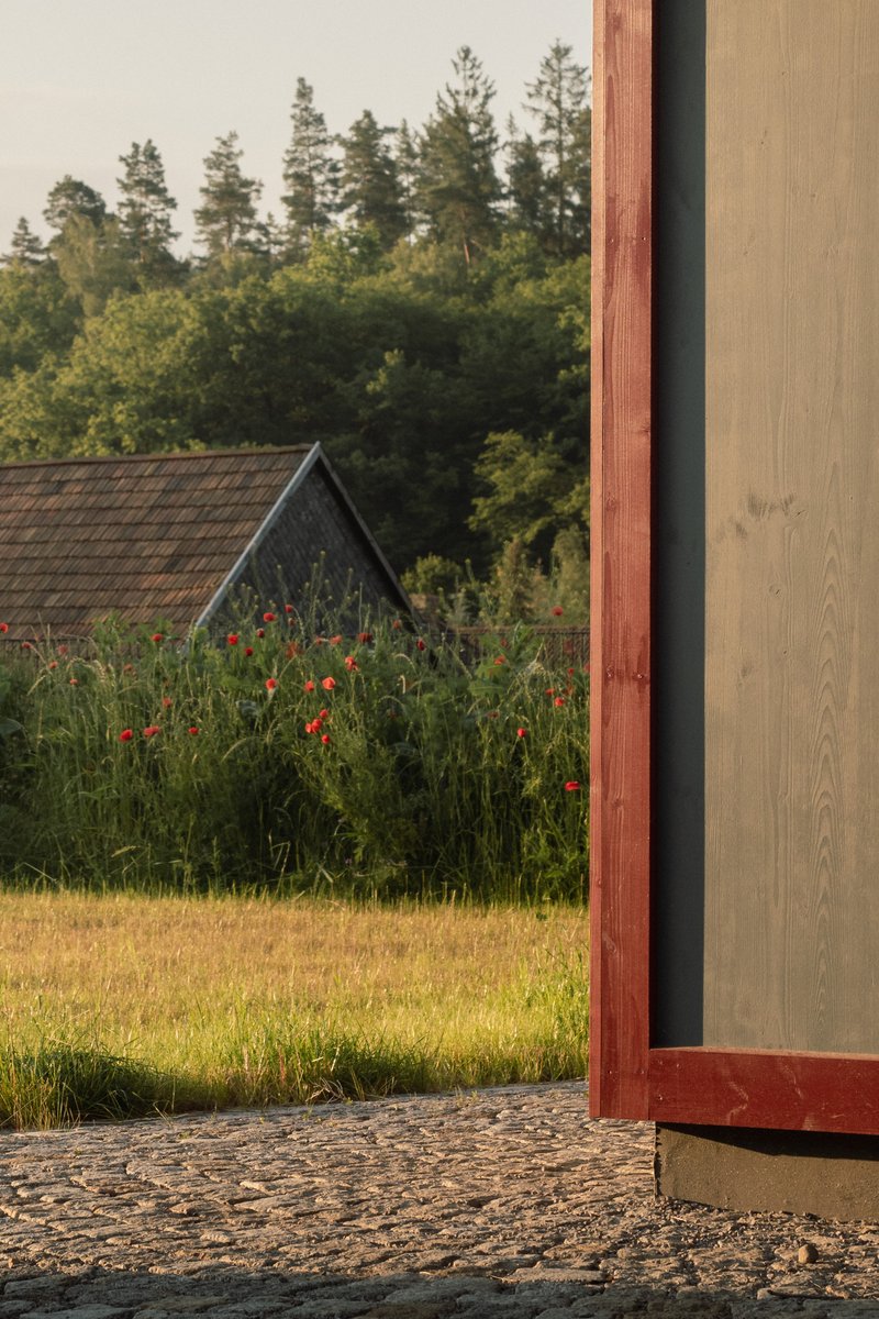 The center’s design emphasizes clarity, simplicity, and durability. The structure rests on strip foundations with a reinforced concrete slab, while the main building is a timber construction. The uniform 1.25 m grid organizes both structural and aesthetic elements, visible inside and out through cover strips and cassettes. The rafter roof construction is expressed internally, with overlapping insulation and natural slate roofing referencing the traditional local architecture. The exterior is clad in color-coated timber panels with vertical profiles that provide protection against weather while evoking a subtle plasticity in form.